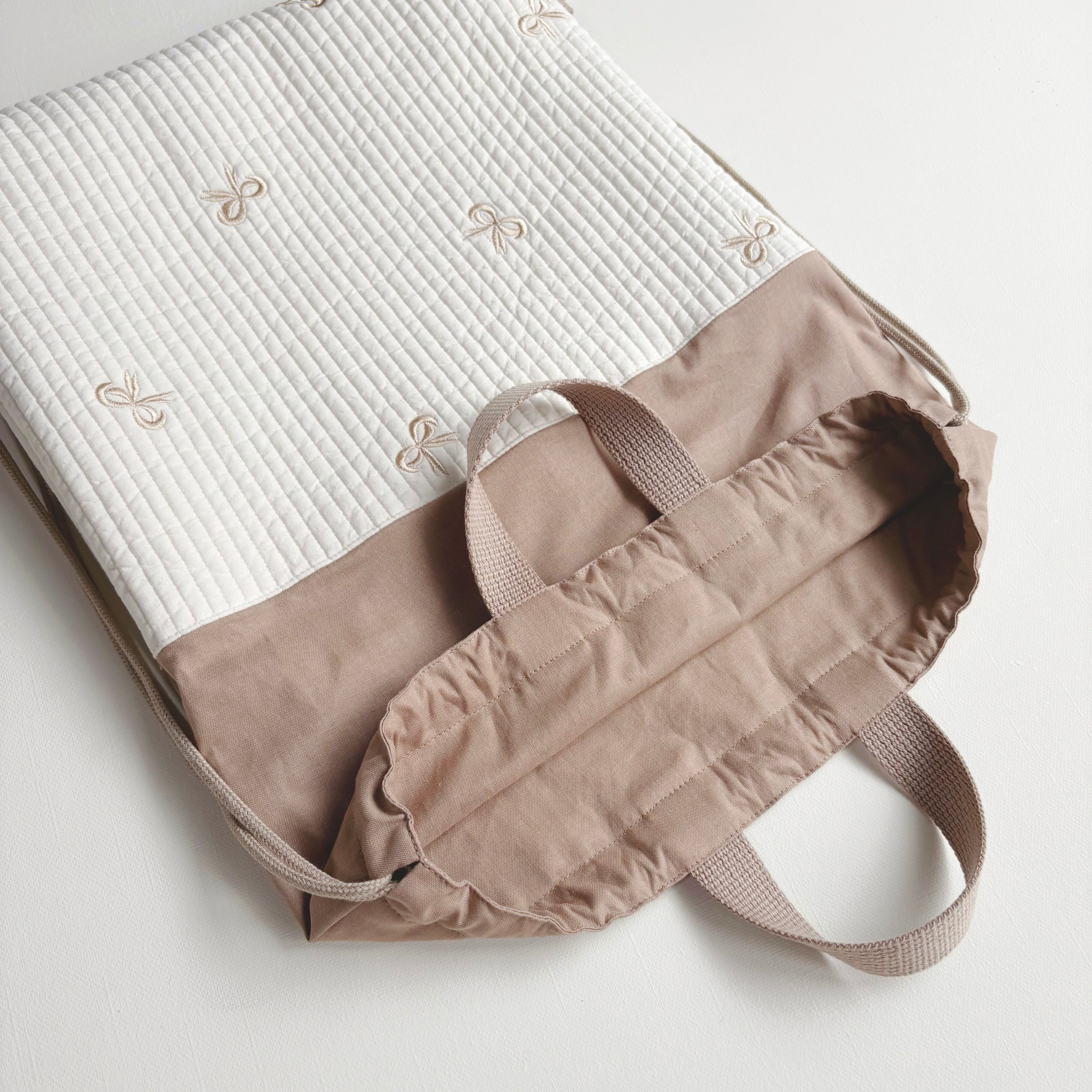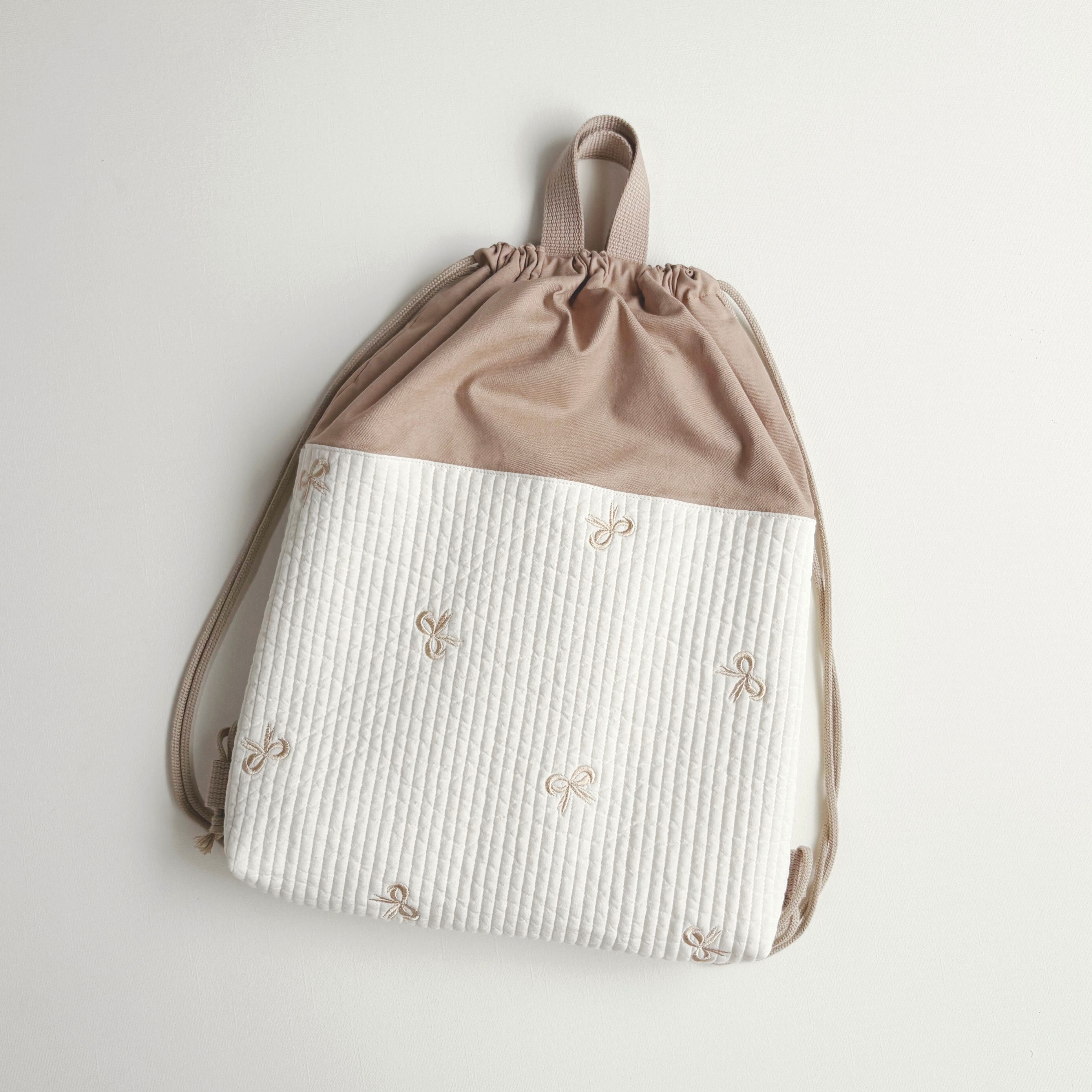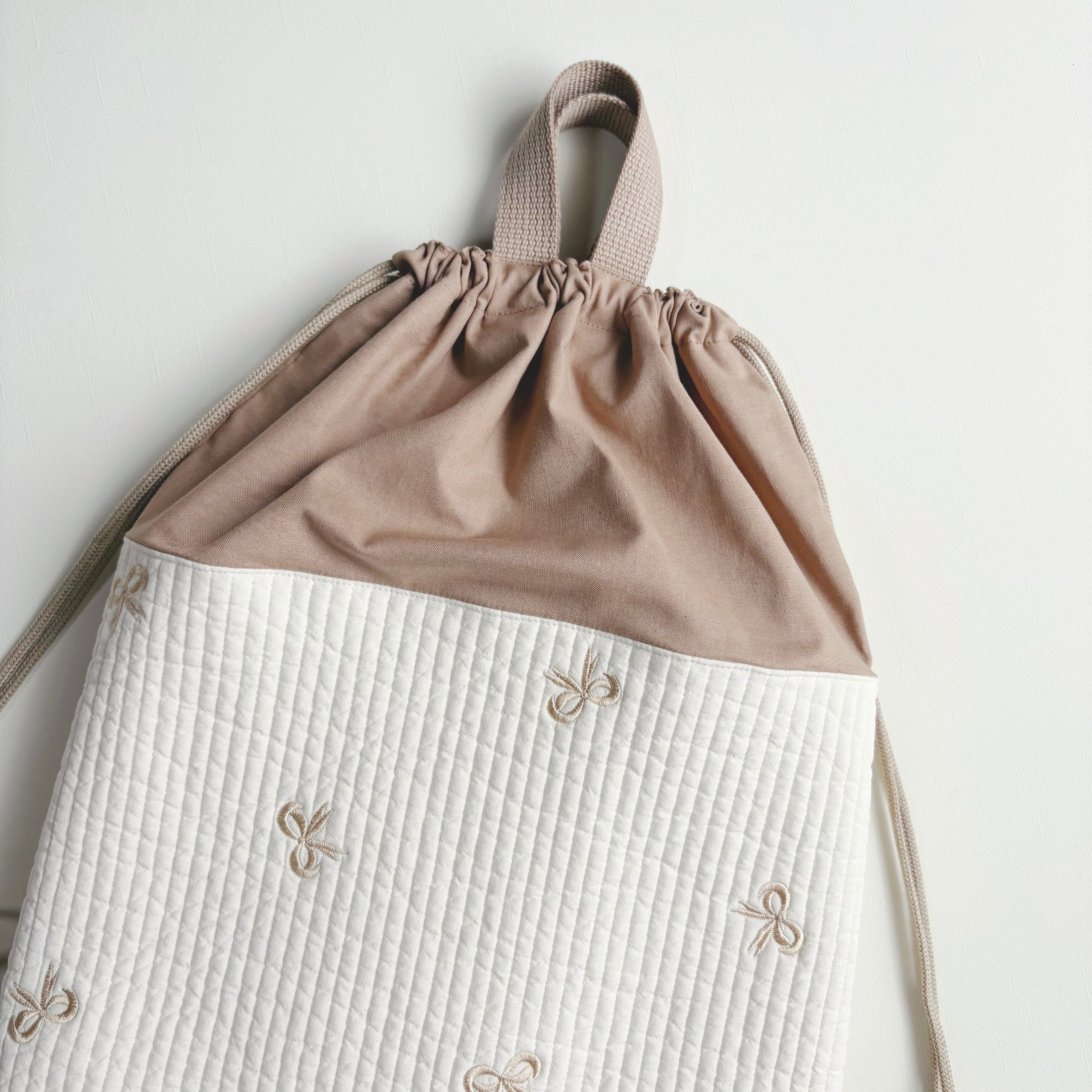 《送料無料》 リボン 刺繍 ヌビ キルト キルティング ナップサック お着替え袋 体操服袋 ブラウン モカ 入園入学 女の子