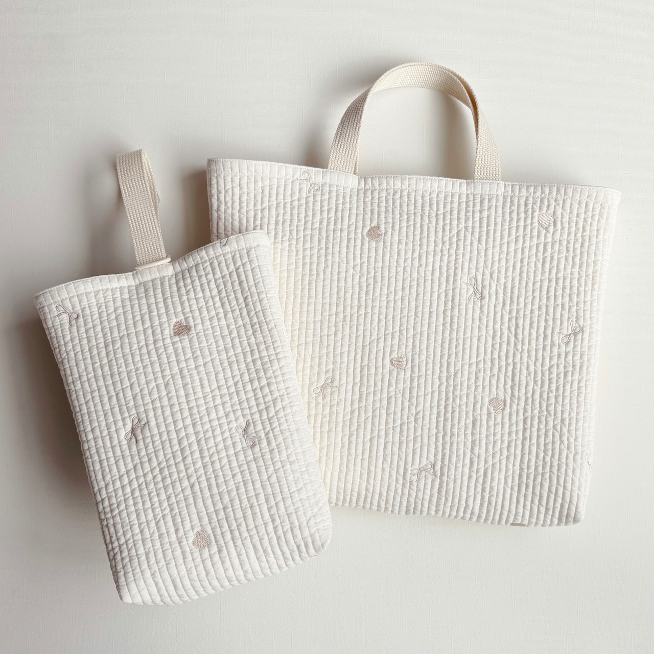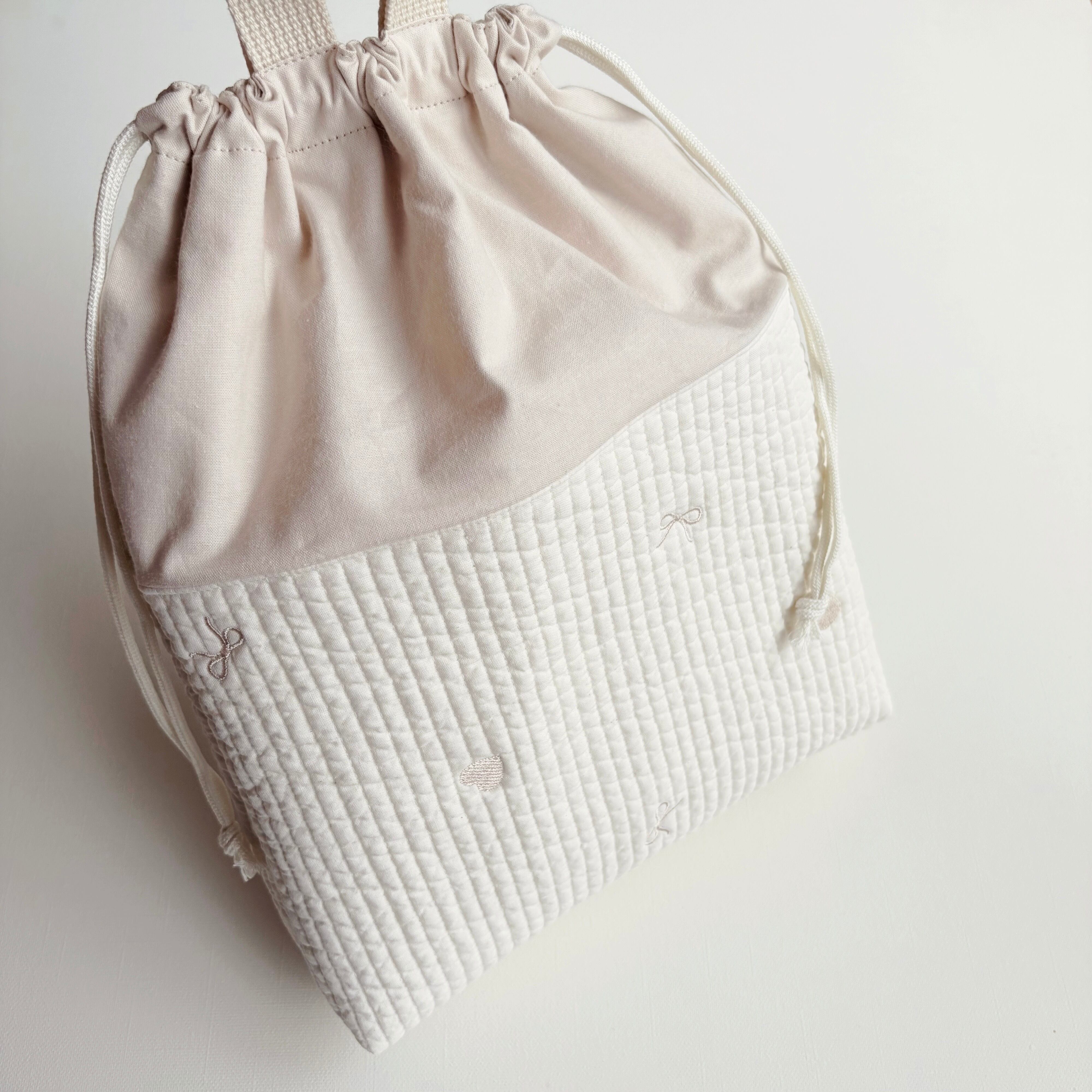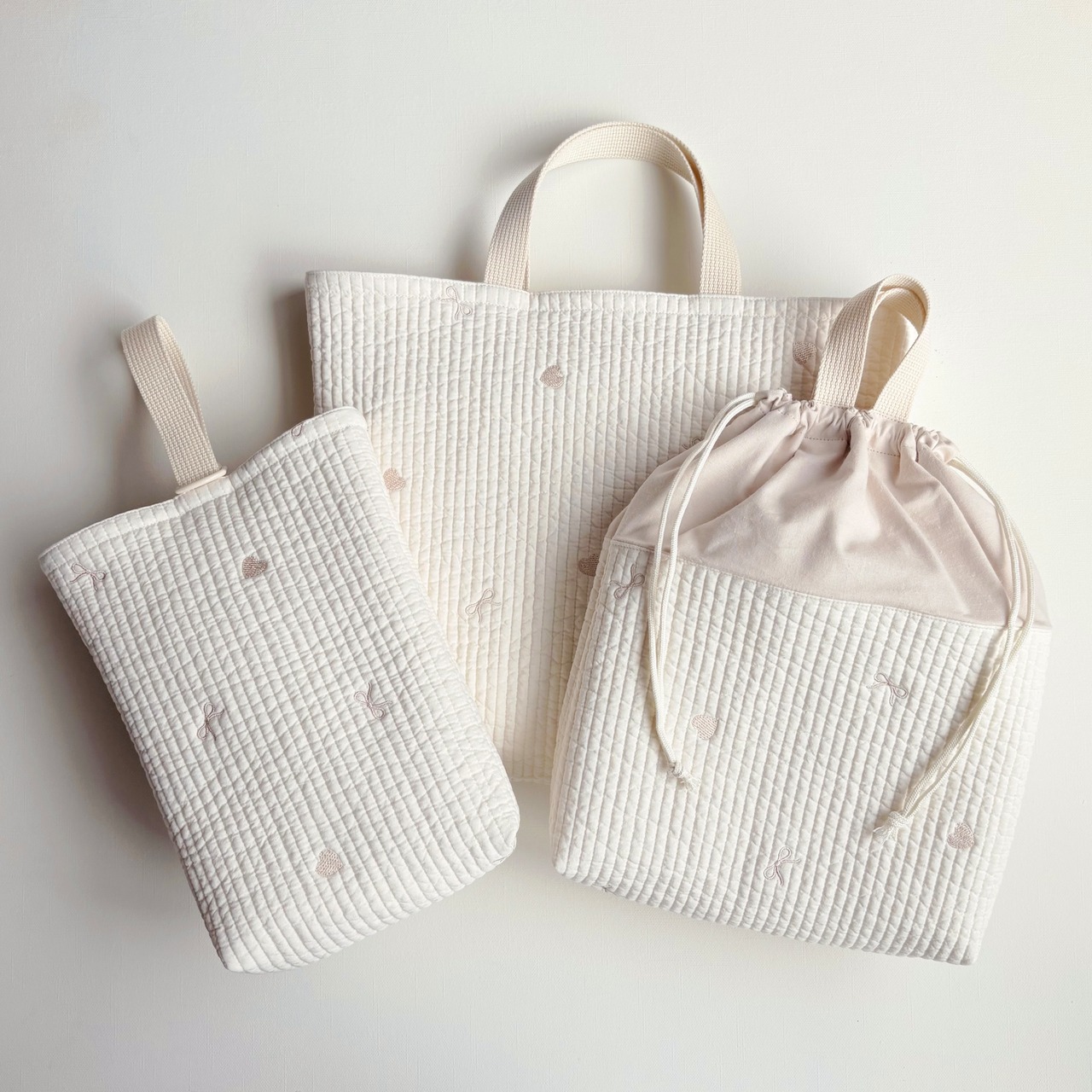 リボン ハート 刺繍 ヌビ キルティング キルト レッスンバッグ 通園バッグ シューズ袋 上靴入れ 体操服入れ お着替え袋 丈夫 シンプル 韓国 かわいい 女の子 入園セット 入学セット 入学準備 入園準備 習い事 プレゼント 誕生日 クリスマス