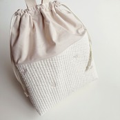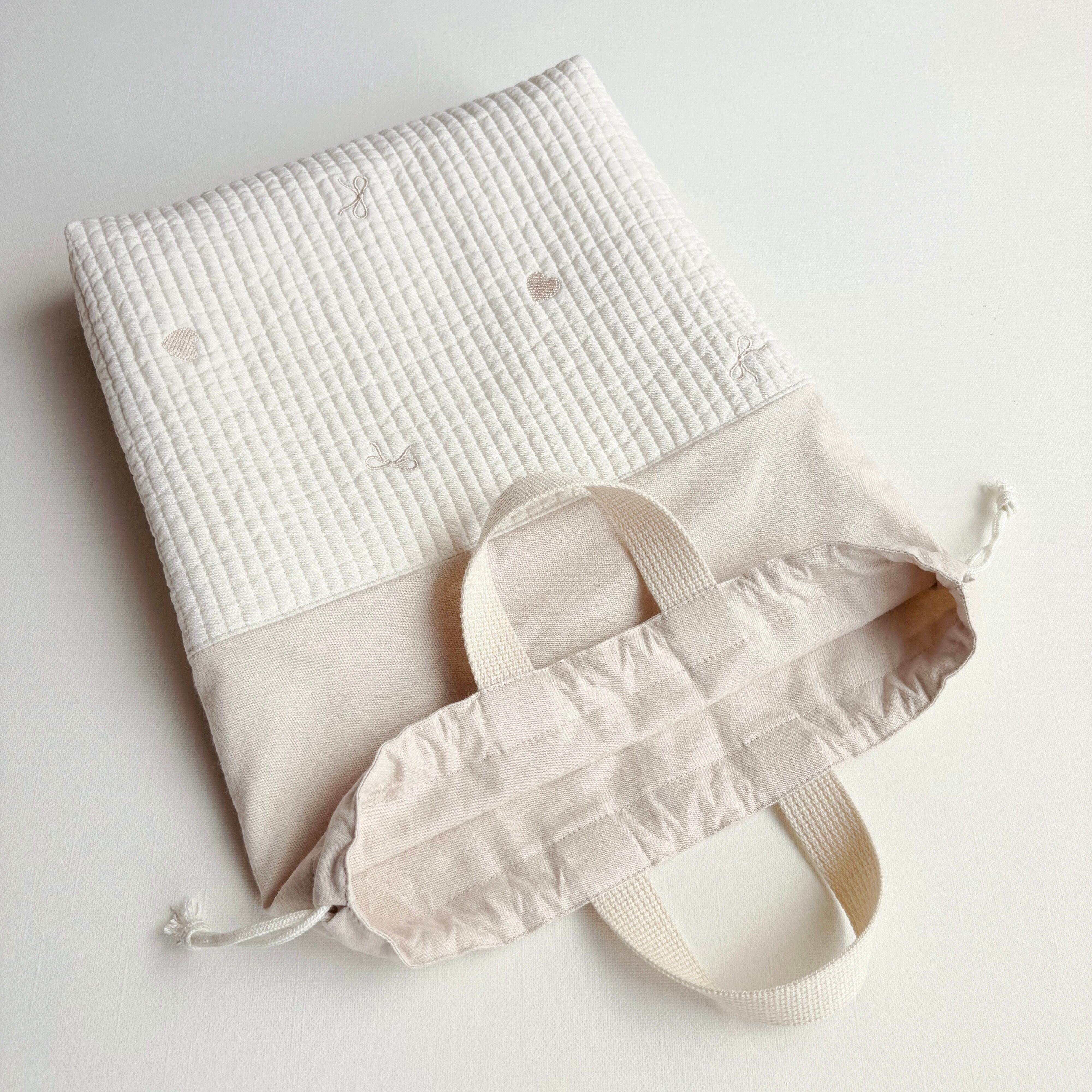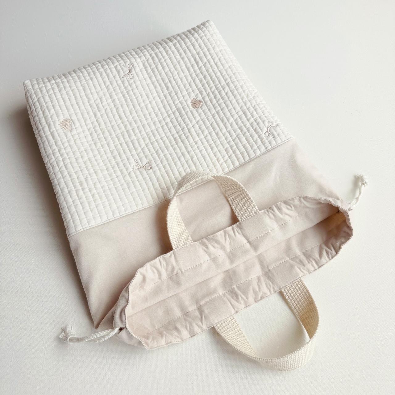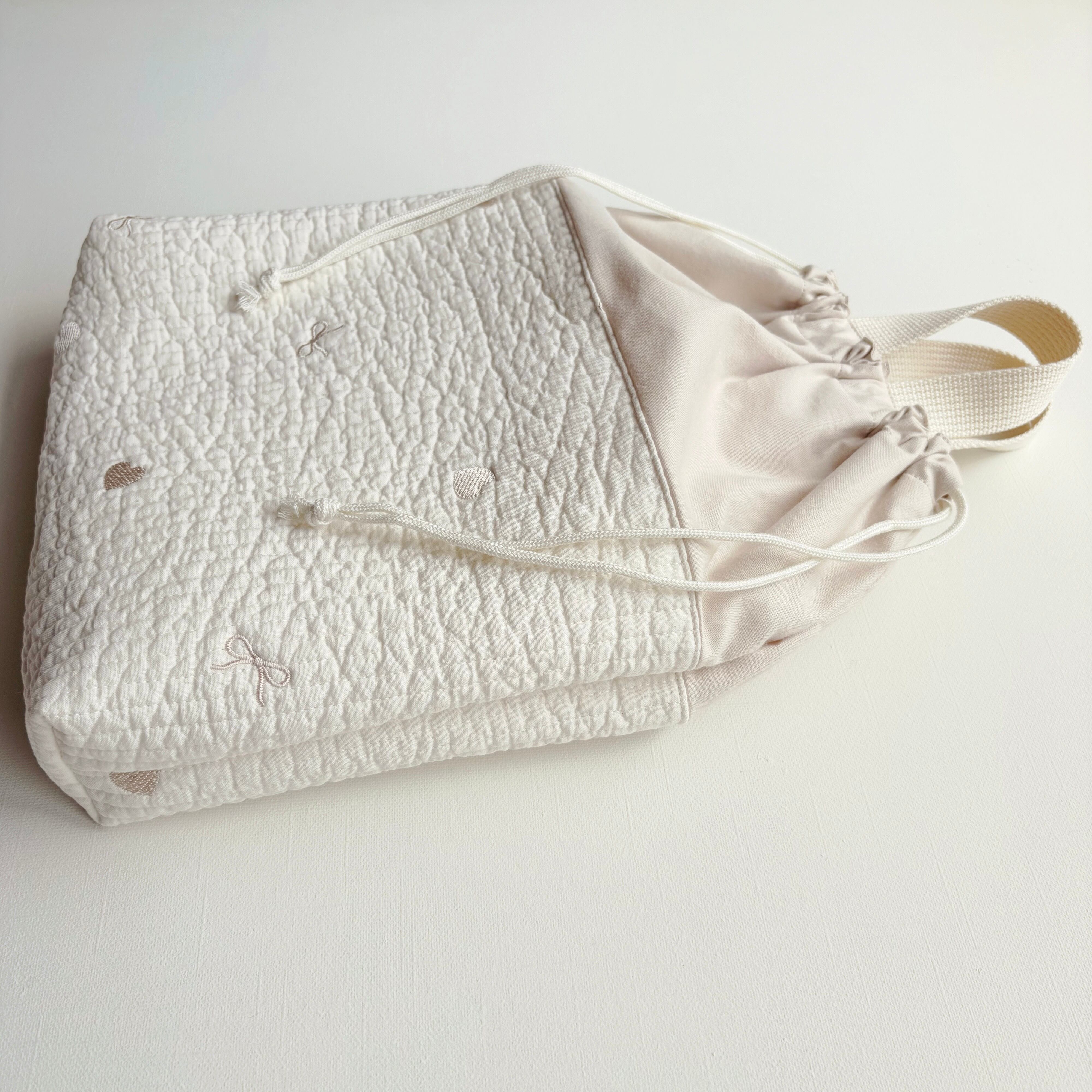 《送料無料》 リボン ハート 刺繍 ヌビ キルト キルティング レッスンバッグ シューズ入れ お着替え袋 入園入学 女の子 ベージュ