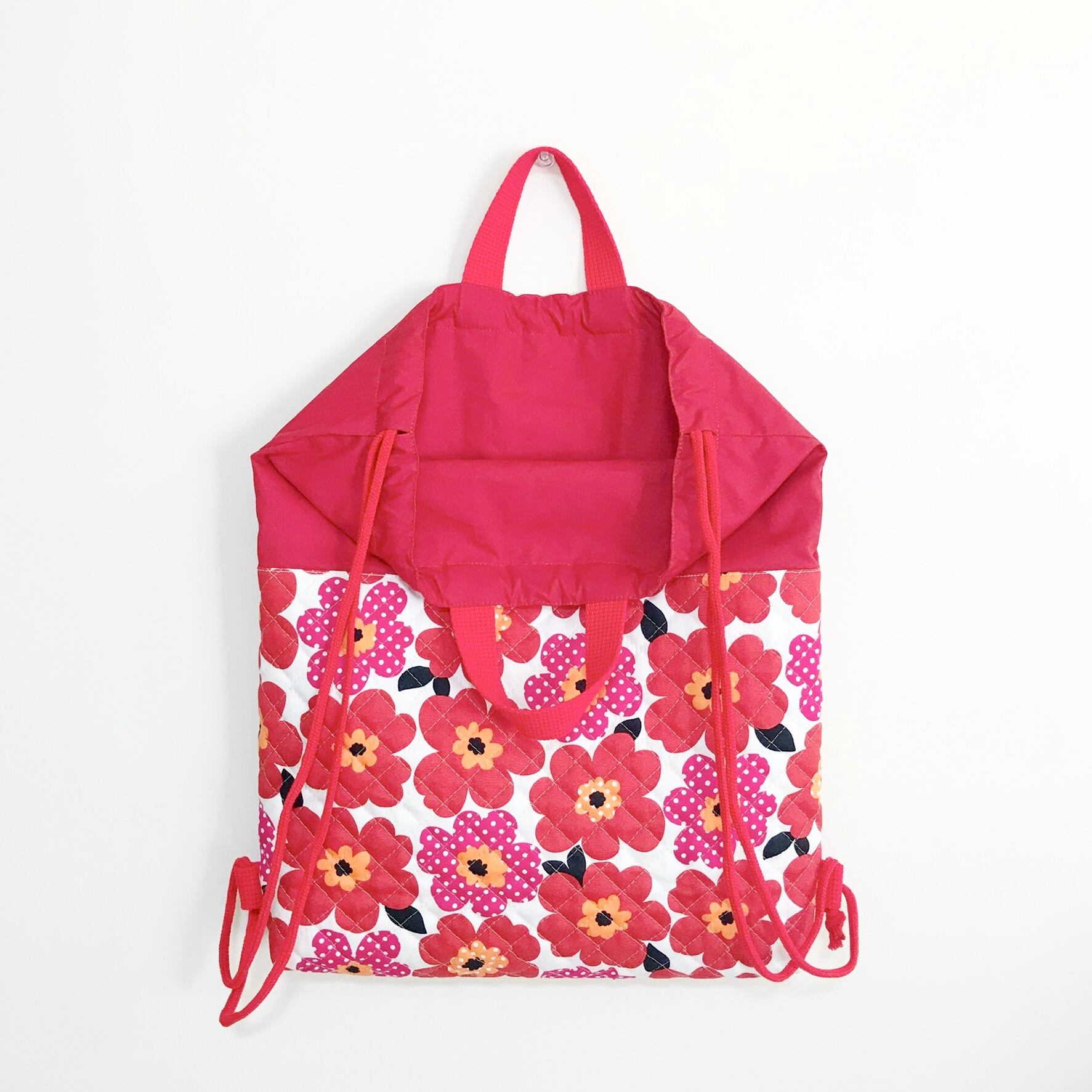 可愛い花柄に赤の裏地と持ち手を合わせました。