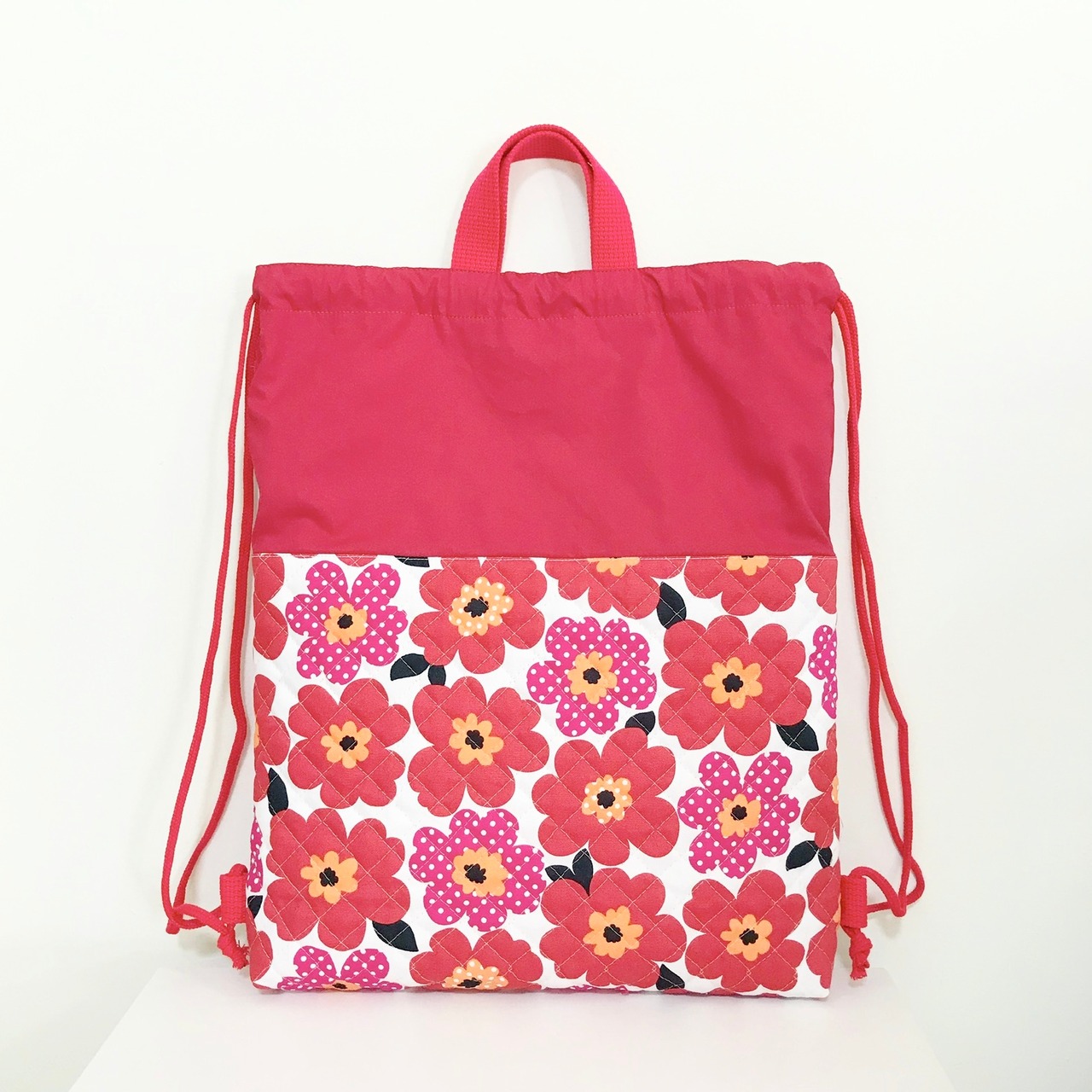 キルティングで作製した、ナップサック型の大きな体操服袋 (裏地付き) です。