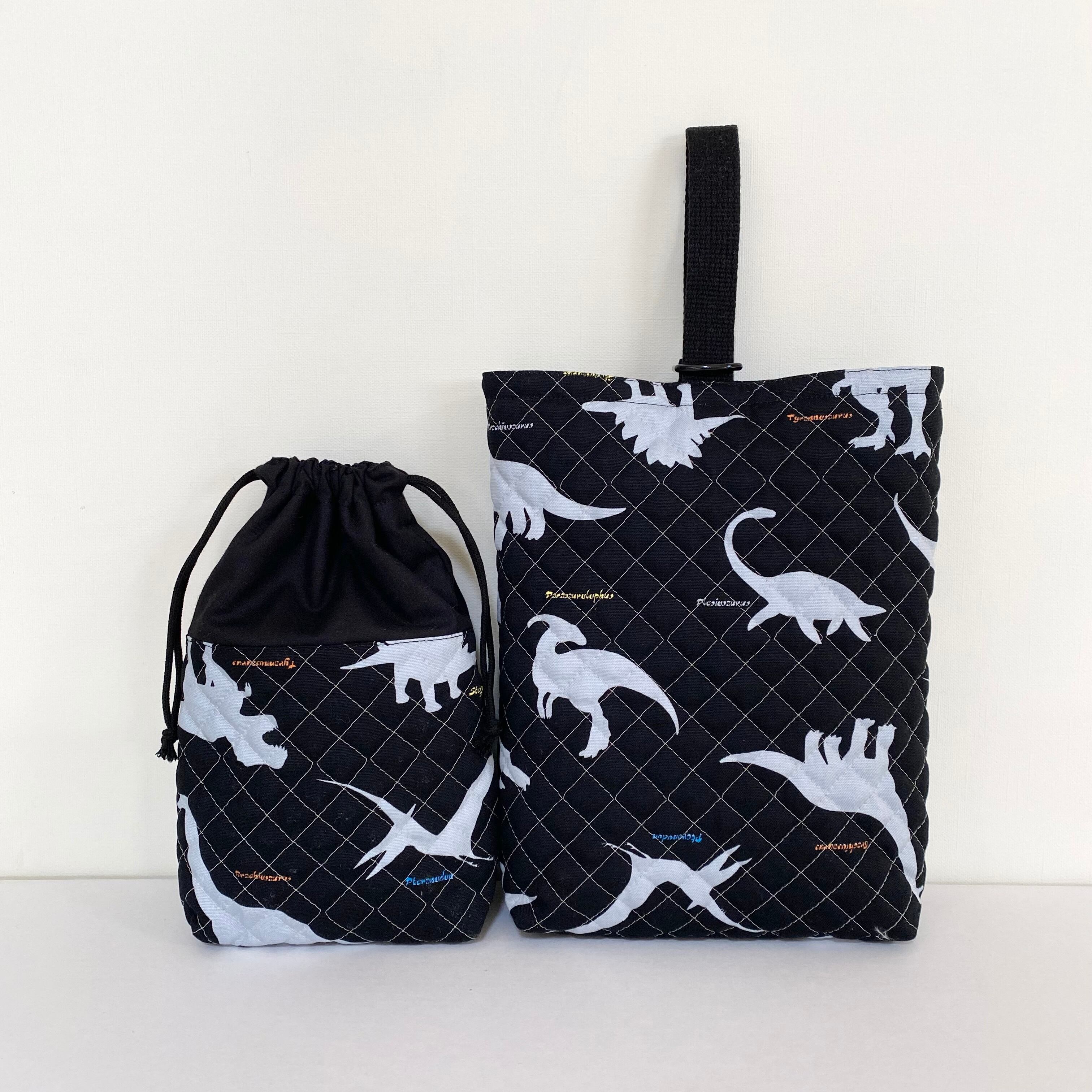 薄いグレーの恐竜シルエットに、持ち手や裏地など全て黒で統一して、かっこよくシンプルに仕上げました。