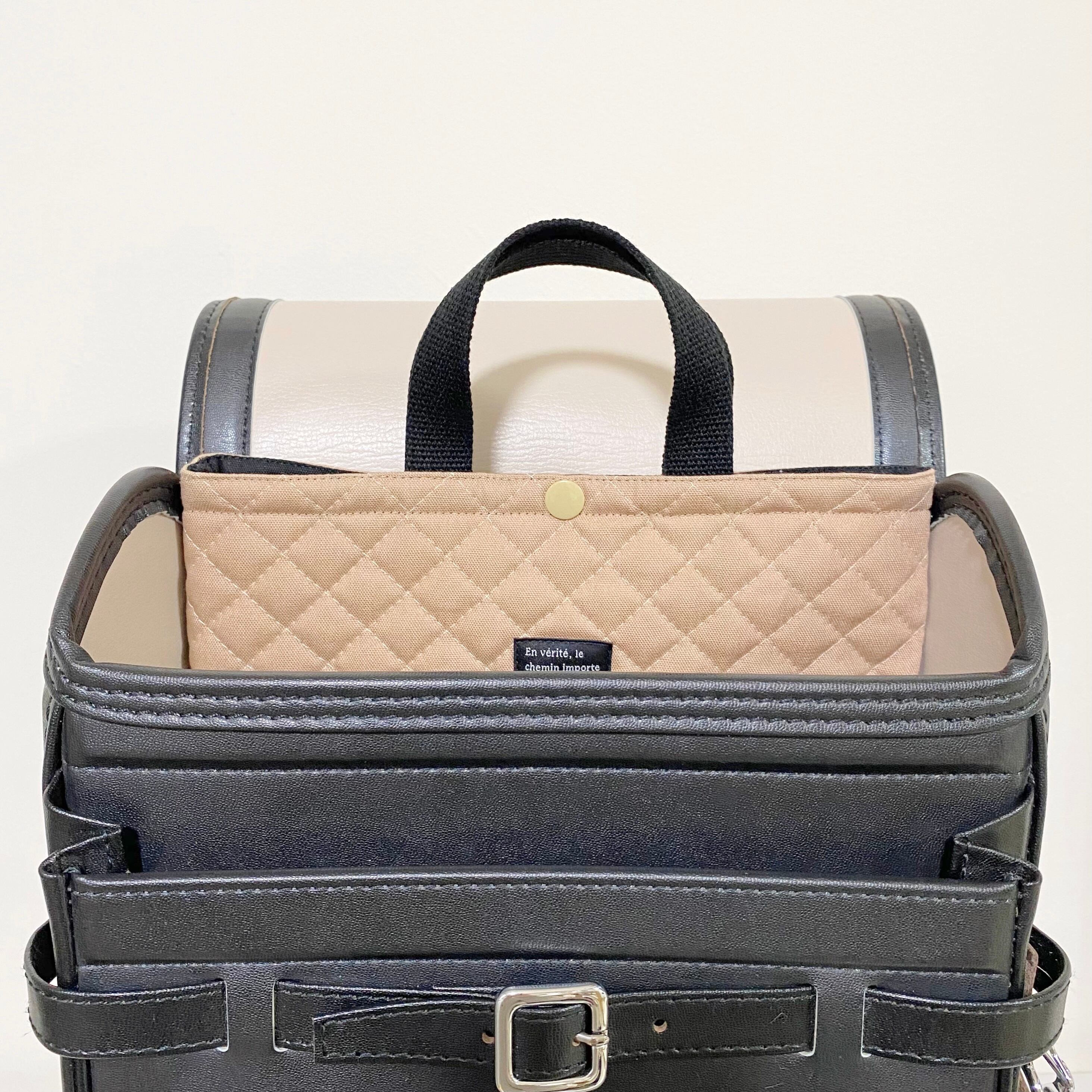 写真は土屋鞄のランドセル(内寸:高さ31cm幅23.2cm)です。ランドセルのメーカーによって内寸が異なりますので、お手持ちのランドセルのサイズを必ずご確認ください。キルティングは柔らかい生地なので端を折り曲げたり折り畳んだりは可能です。