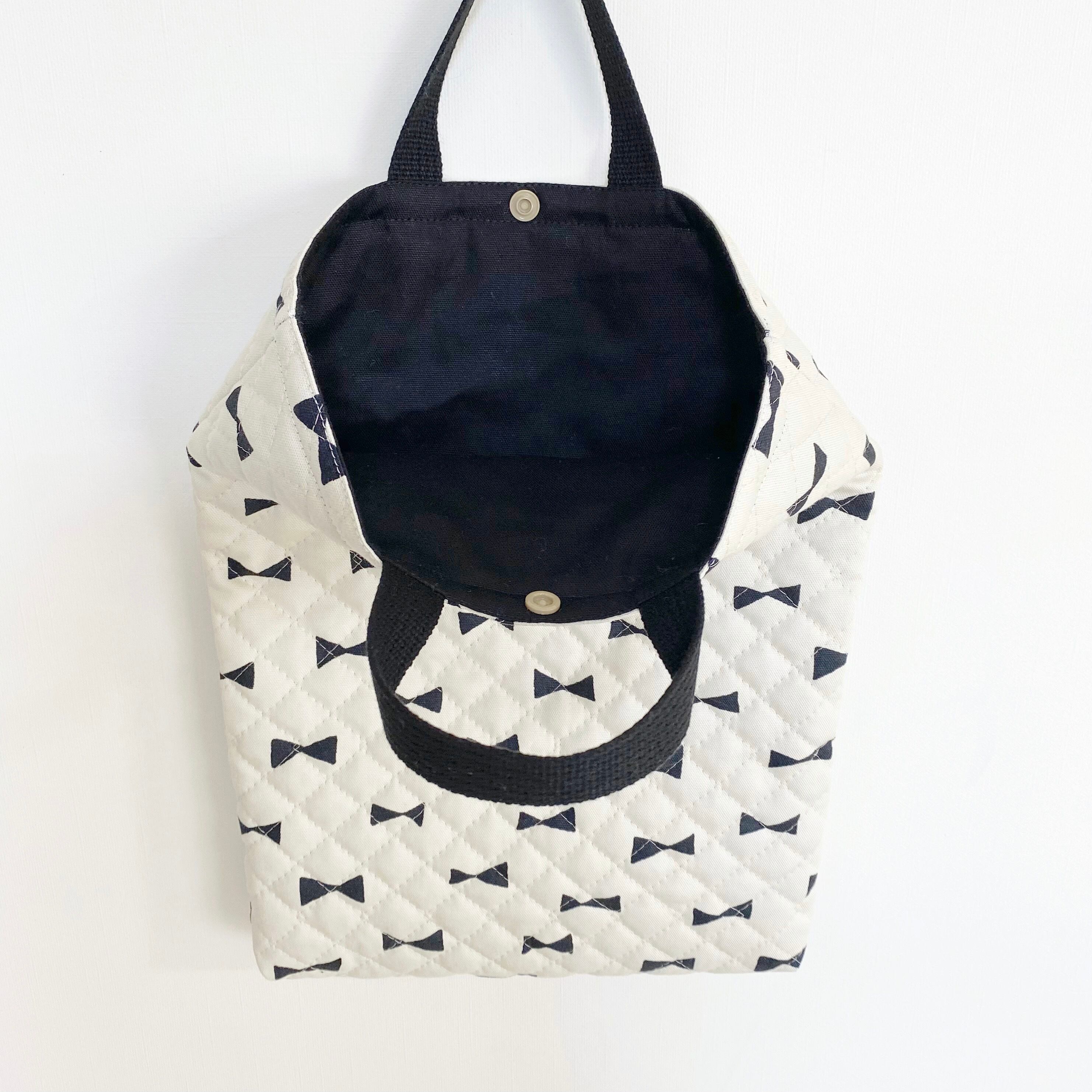 リボン柄のキルティング生地に、裏地や持ち手は黒で統一してシンプルなデザインでお作りしました。