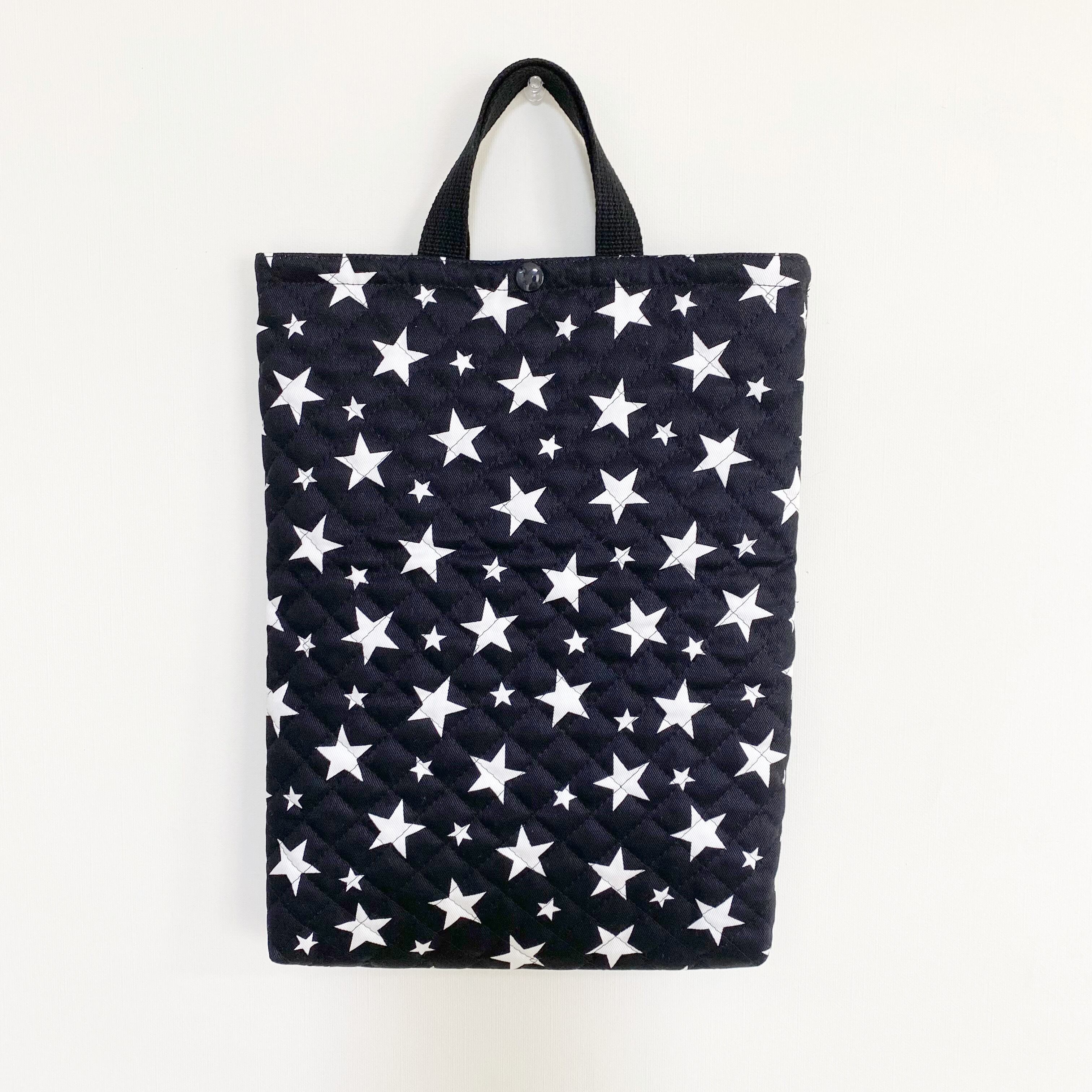 星柄のキルティング生地に、裏地や持ち手は黒で統一してシンプルなデザインでお作りしました。シンプルなデザインだからこそかわいく、そして長くお使いいただけると思います。