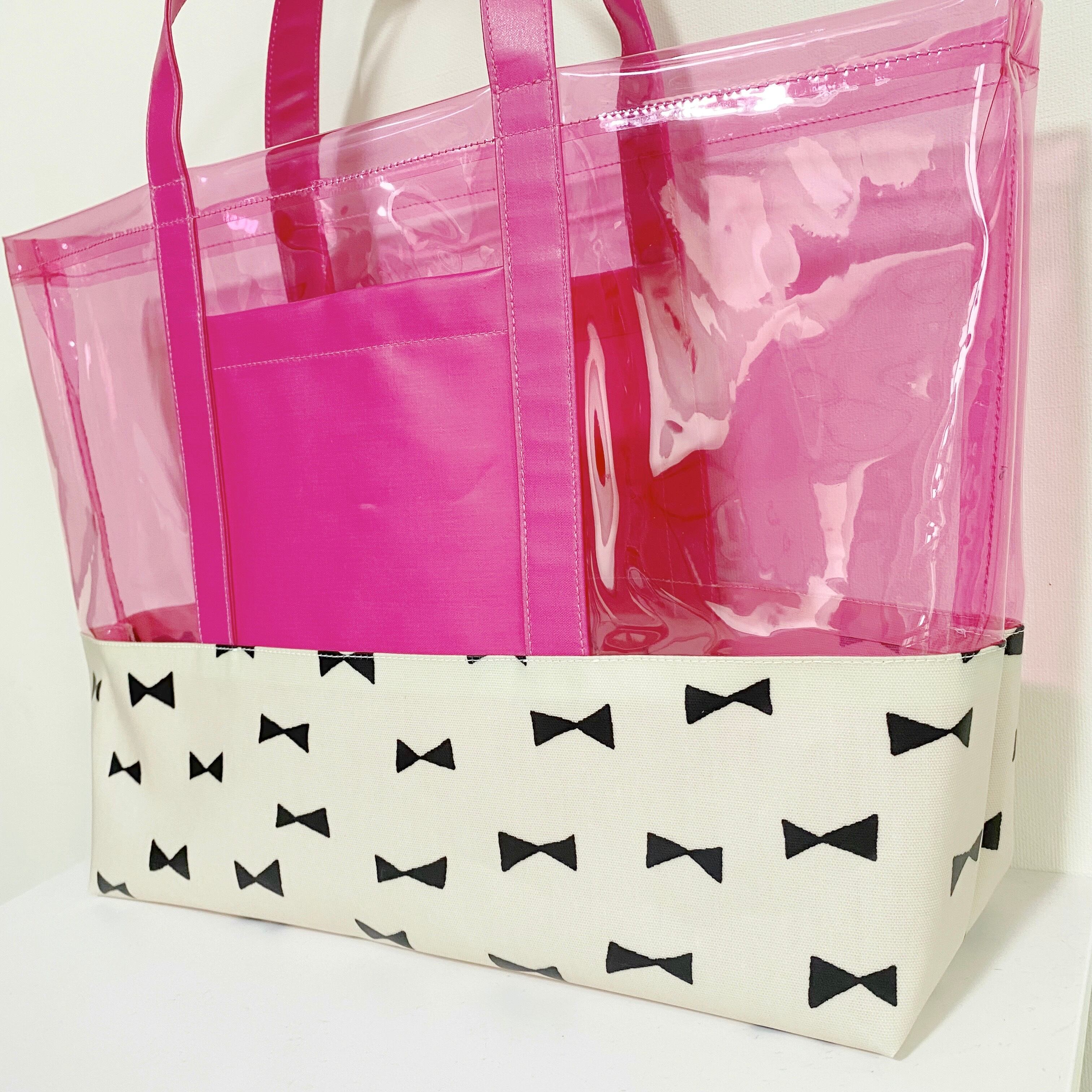透明ビニール生地と、ラミネート生地で作ったプールバッグです。両面にそれぞれ外ポケットが付いています。