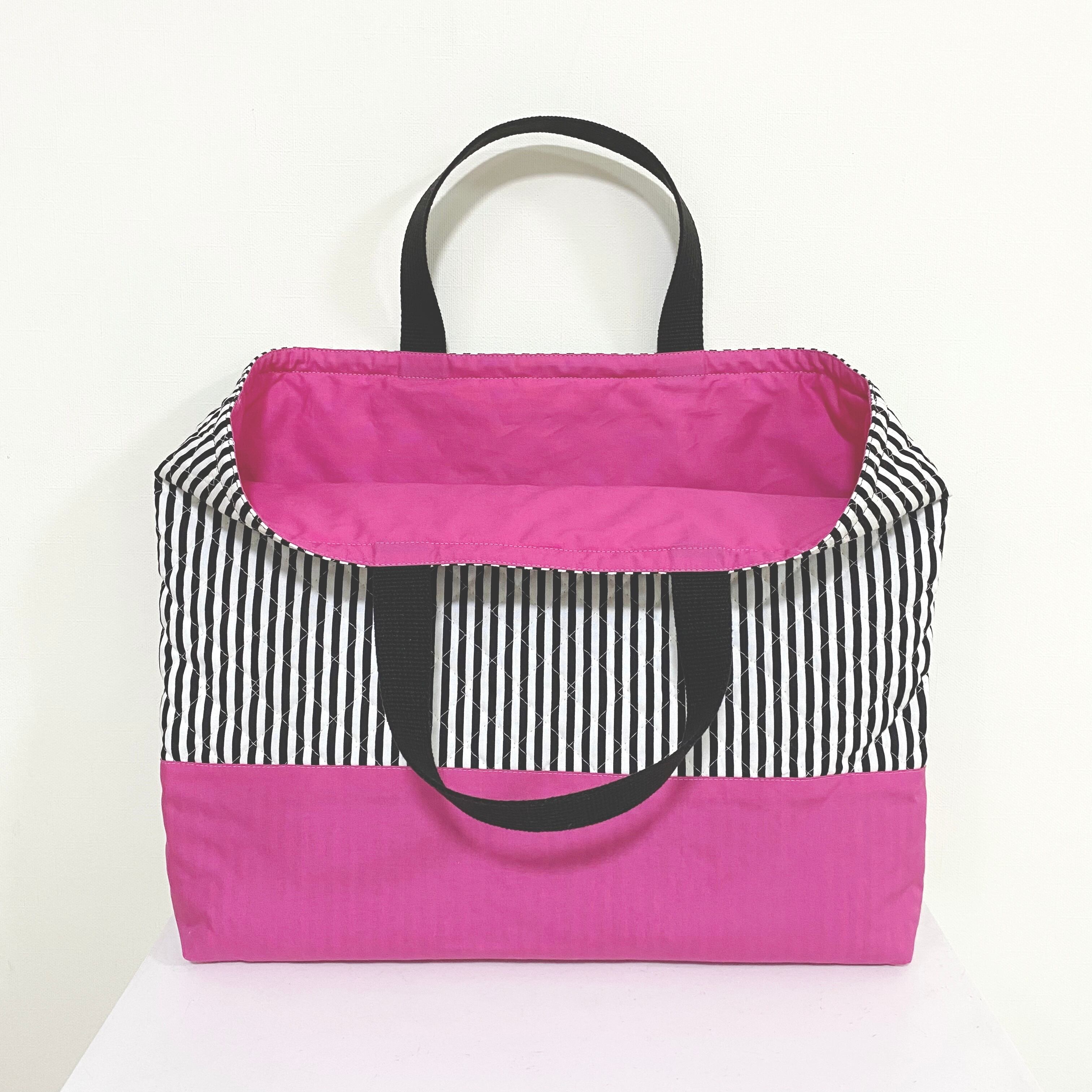 白黒の細いストライプ柄に、切り替えと裏地は鮮やかなピンクを合わせました。