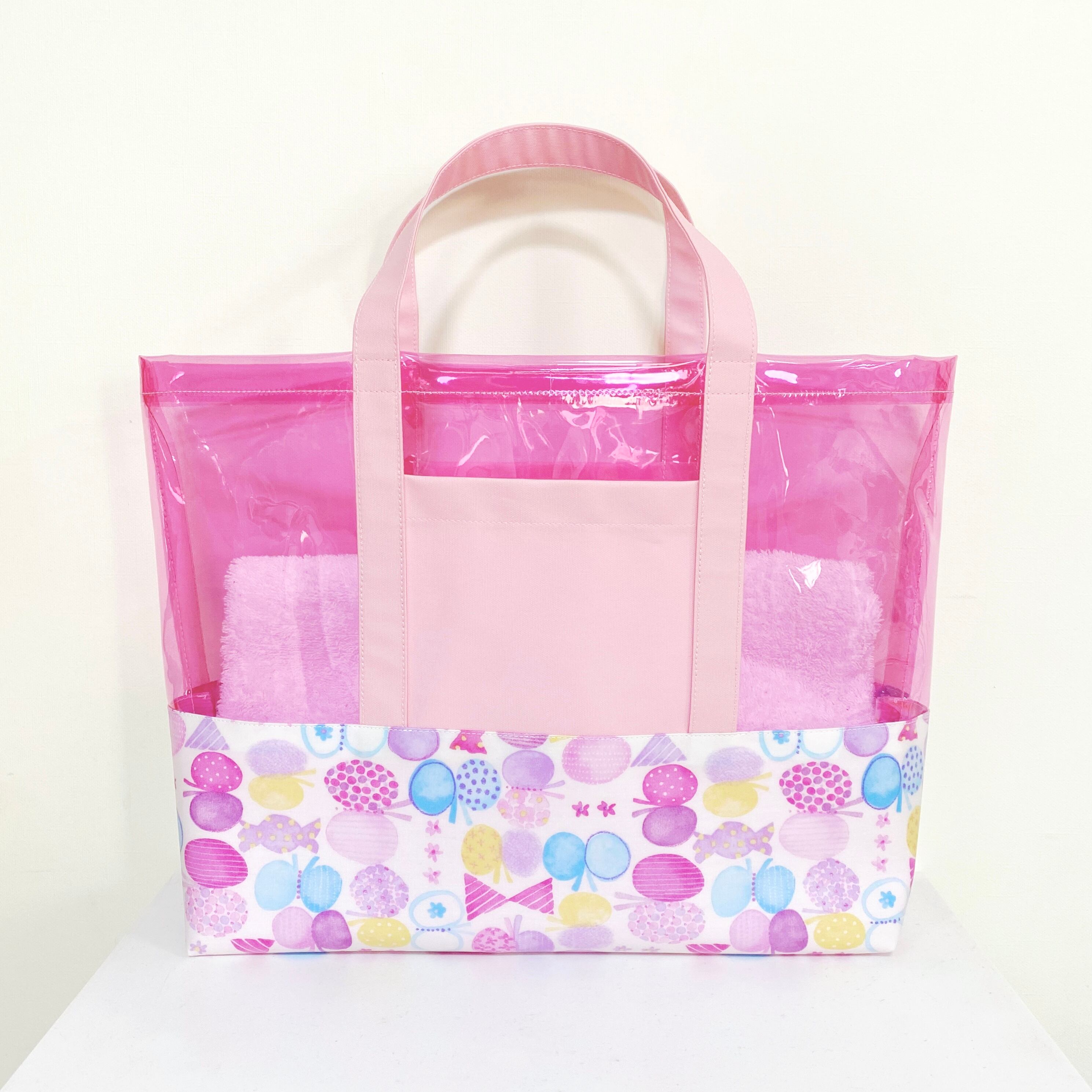 透明ビニール生地と、ラミネート生地で作ったプールバッグです。両面にそれぞれ外ポケットが付いています。
