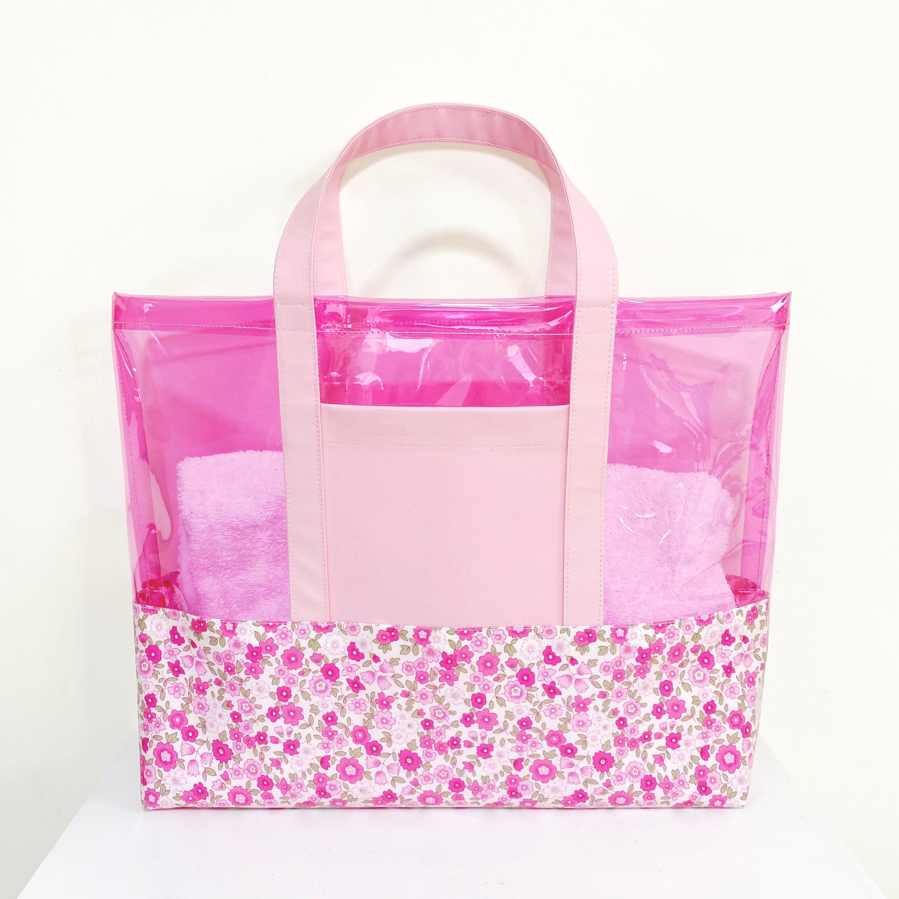 透明ビニール生地と、ラミネート生地で作ったプールバッグです。両面にそれぞれ外ポケットが付いています。