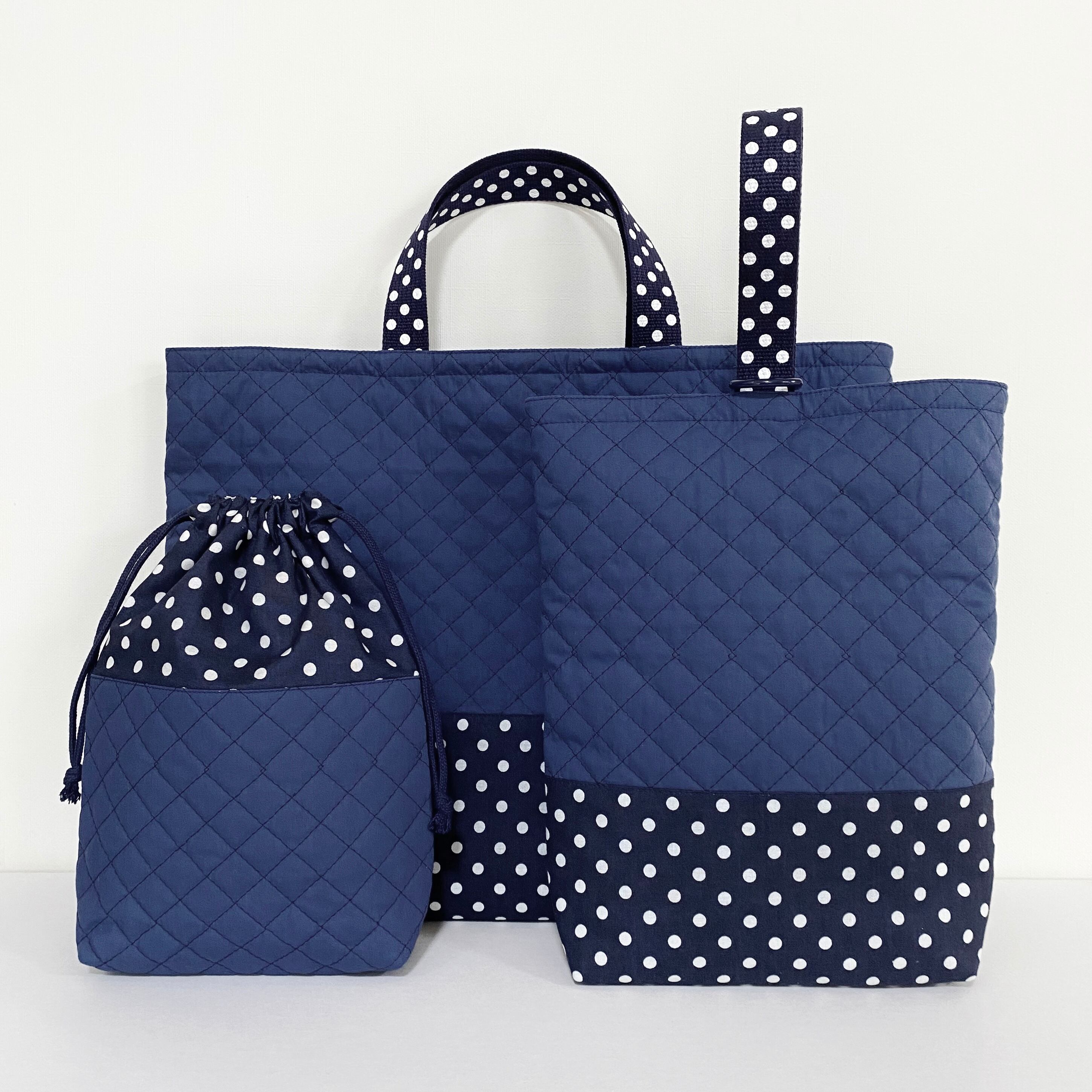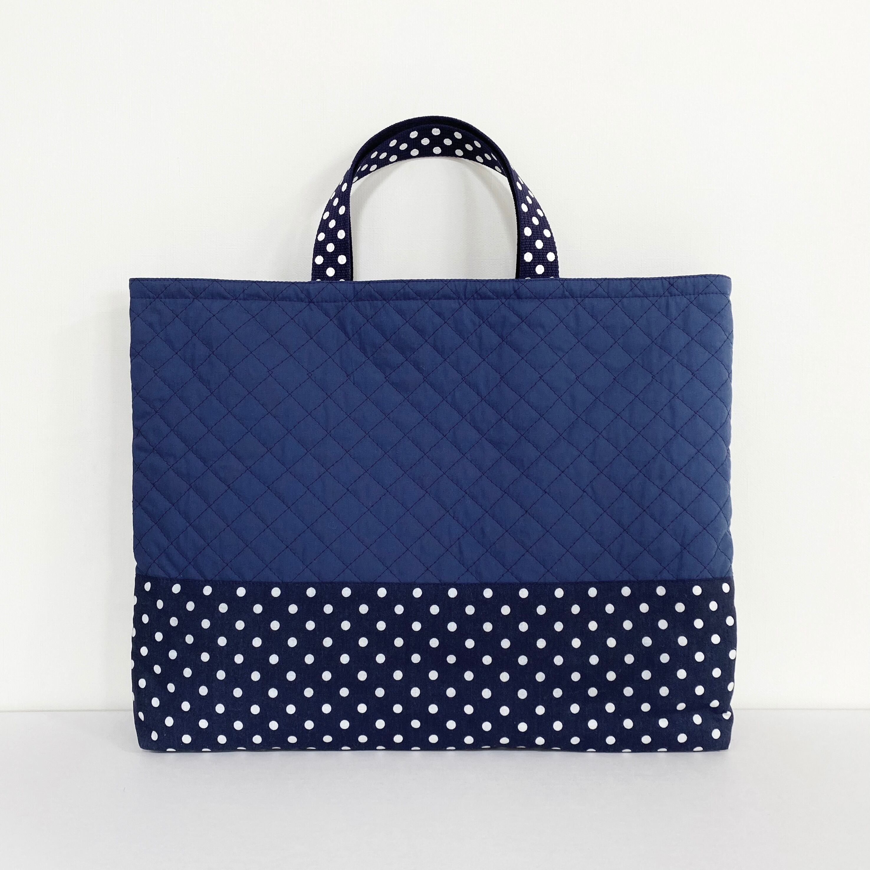 無地のネイビーキルティングに、可愛いドットの持ち手と底布を合わせました。(ドット約5mm)