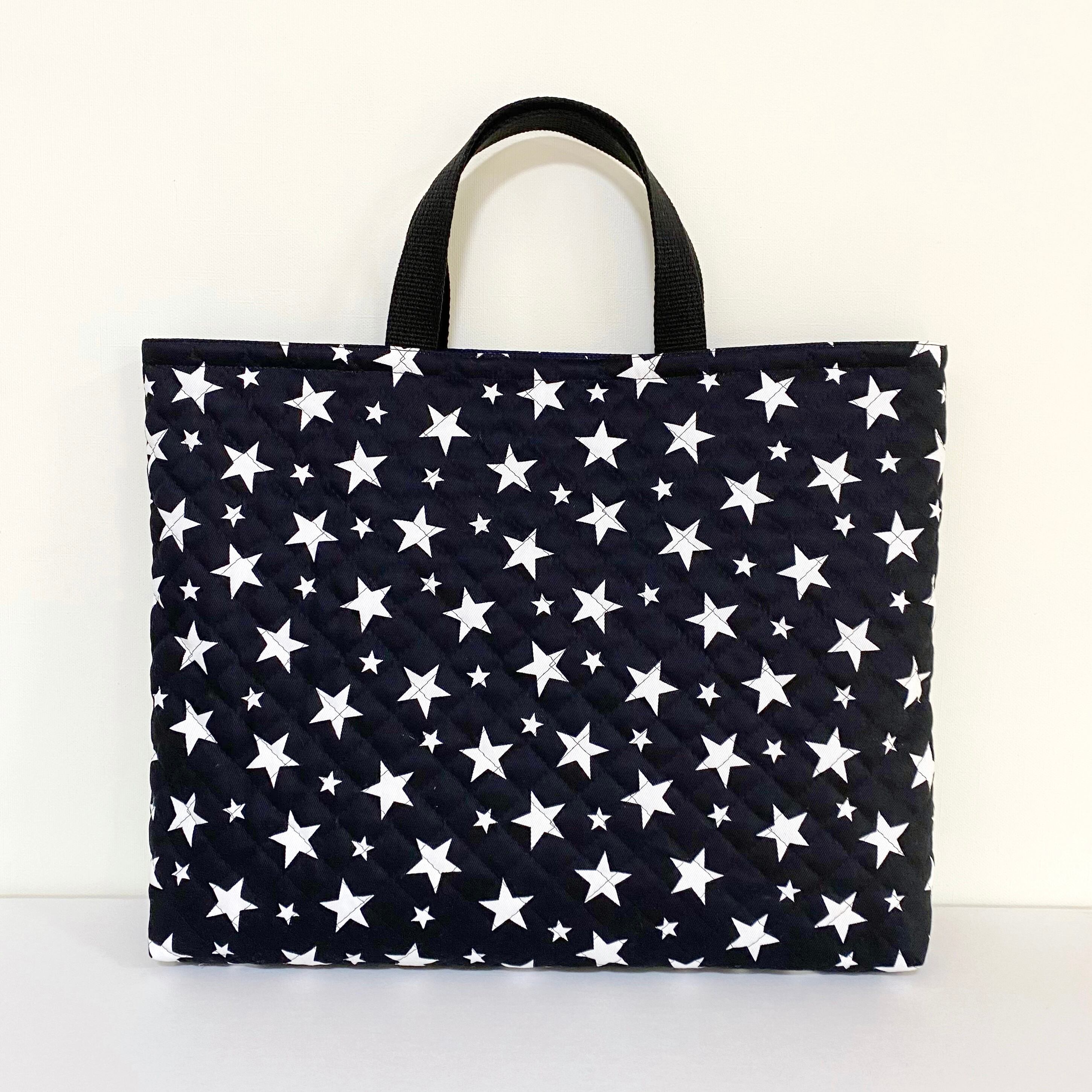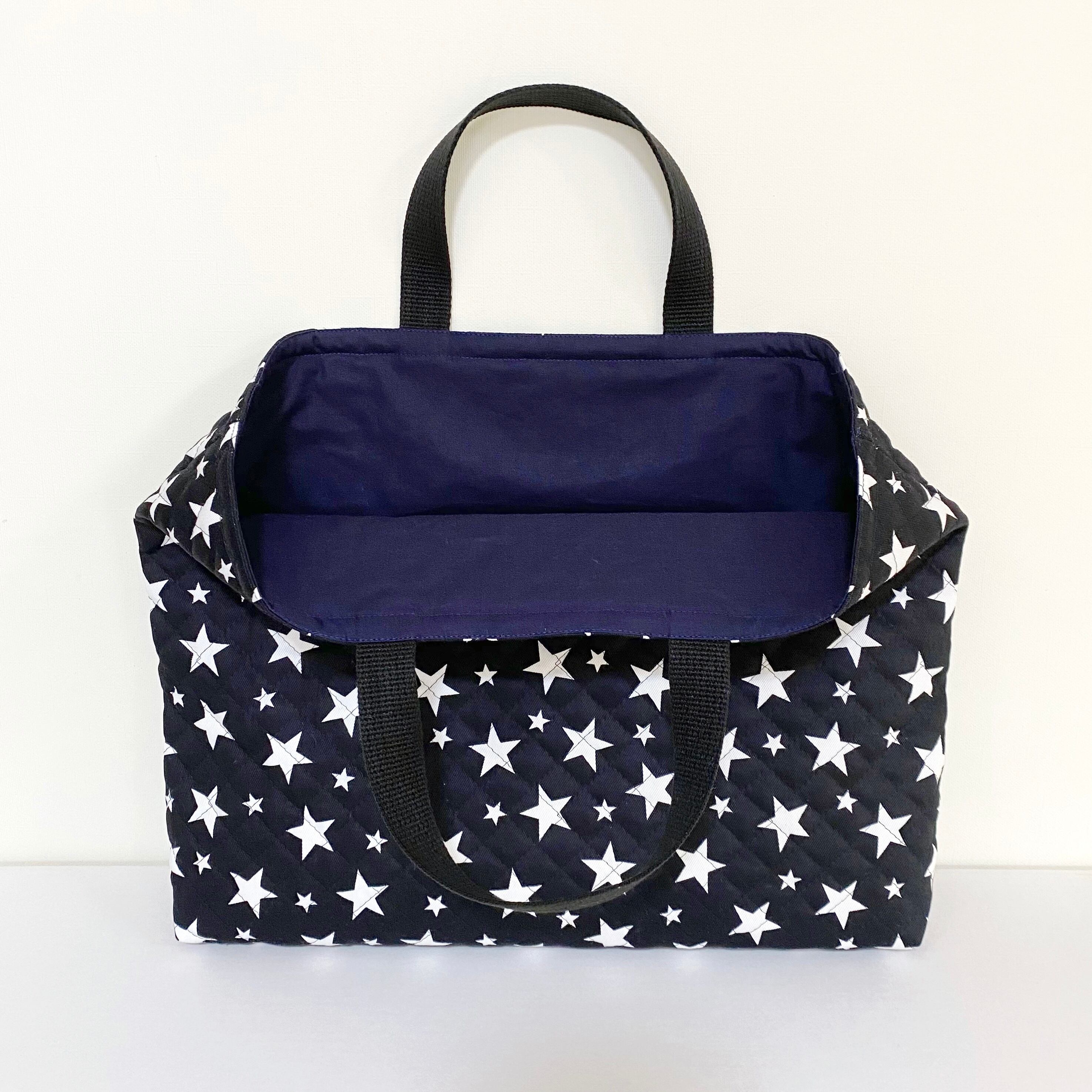 おしゃれな白黒の星柄にネイビーの裏地を合わせて、シンプルに仕上げました。大きくなっても飽きがこずに長くお使いいただけると思います。