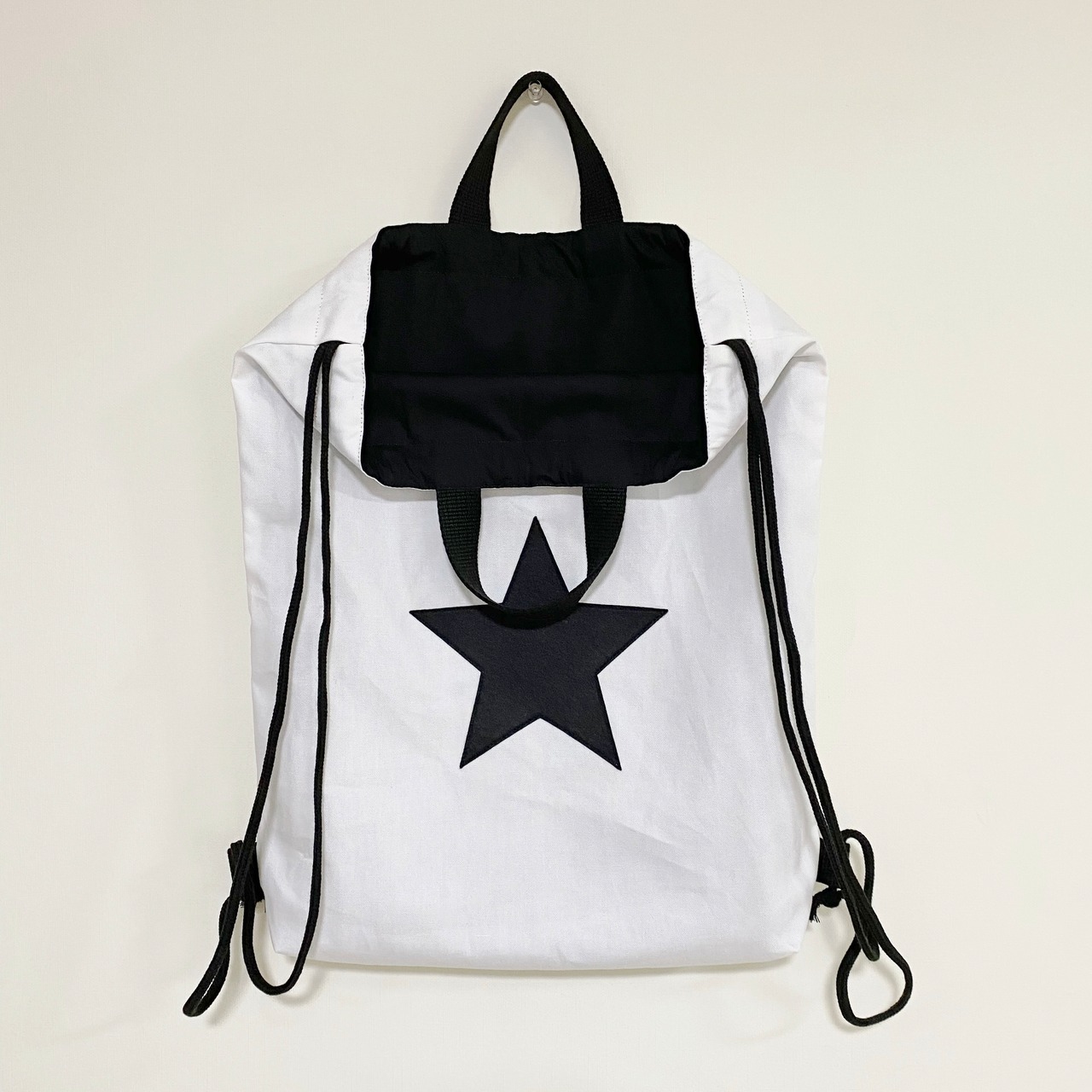 白の無地に黒の星型のフェルトを縫い合わせて、シンプルに仕上げました。(裏地は黒の無地です)
