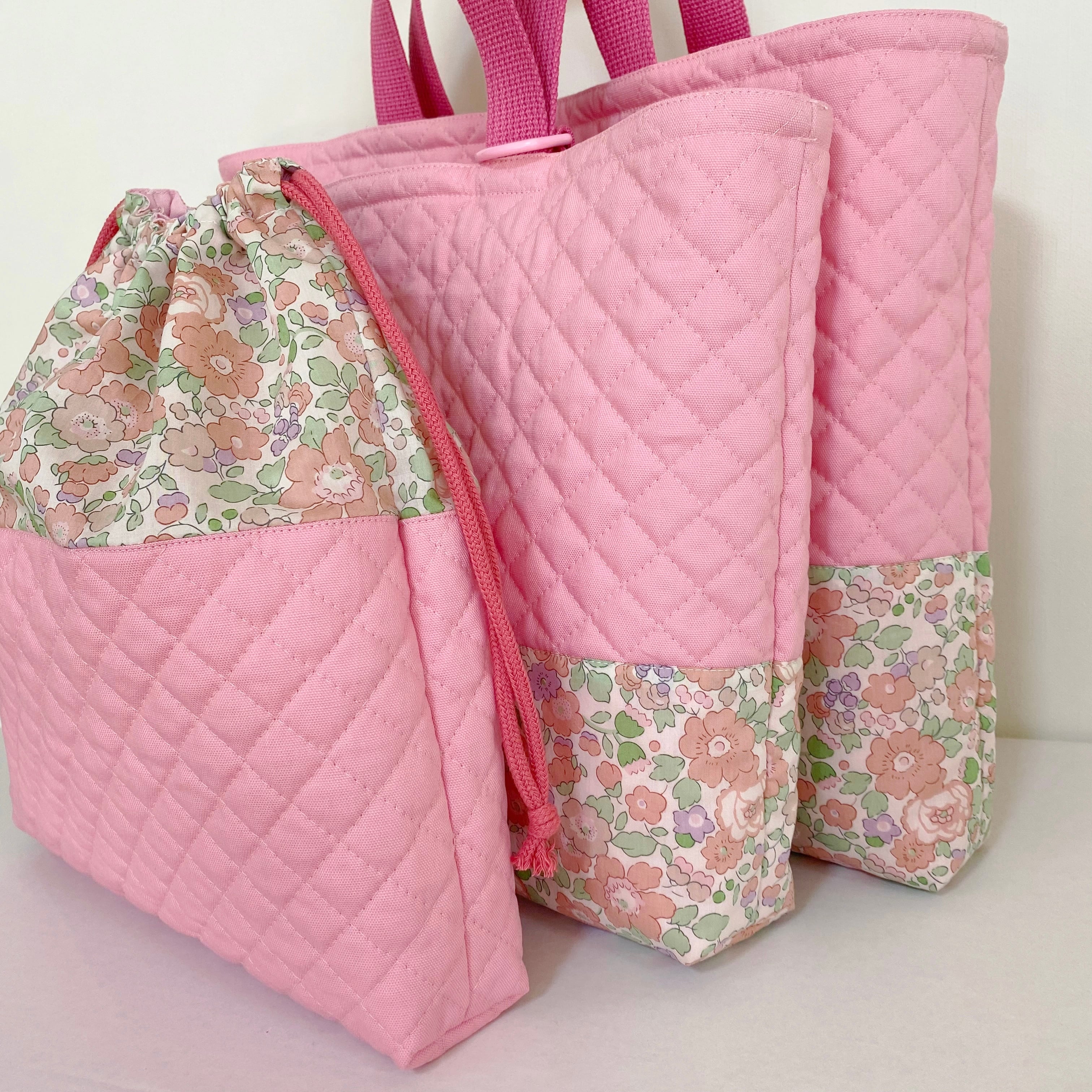 キルティング生地にリバティプリント(英国リバティ社の有名なタナローン生地『ベッツィ』)を合わせました。裏地は3点ともベビーピンクです。
