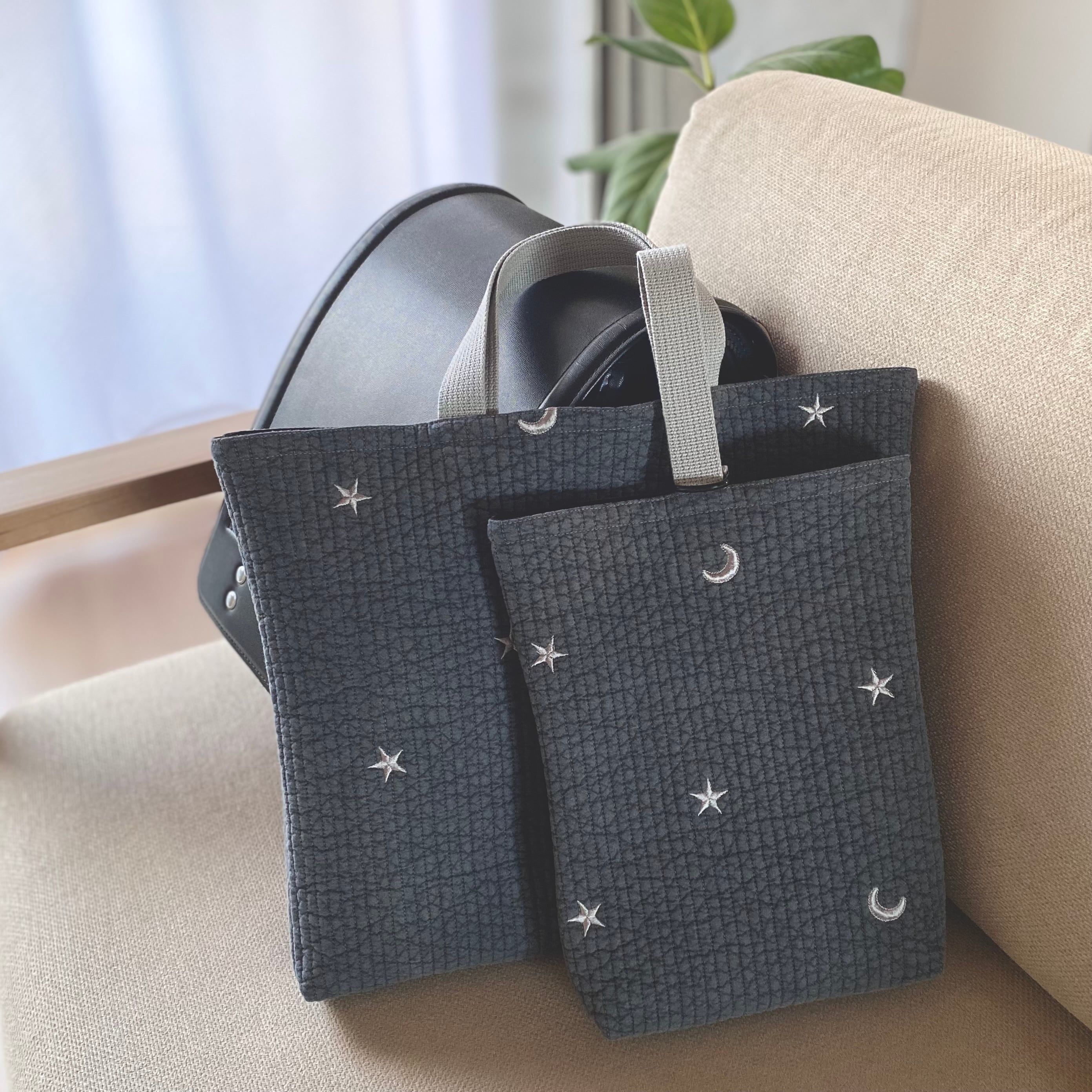 星や月の刺繍が優しくデザインされたダークグレーのヌビに、黒とグレーを合わせました。シンプルなデザインで大きくなっても飽きがこずに長くお使いいただけると思います。