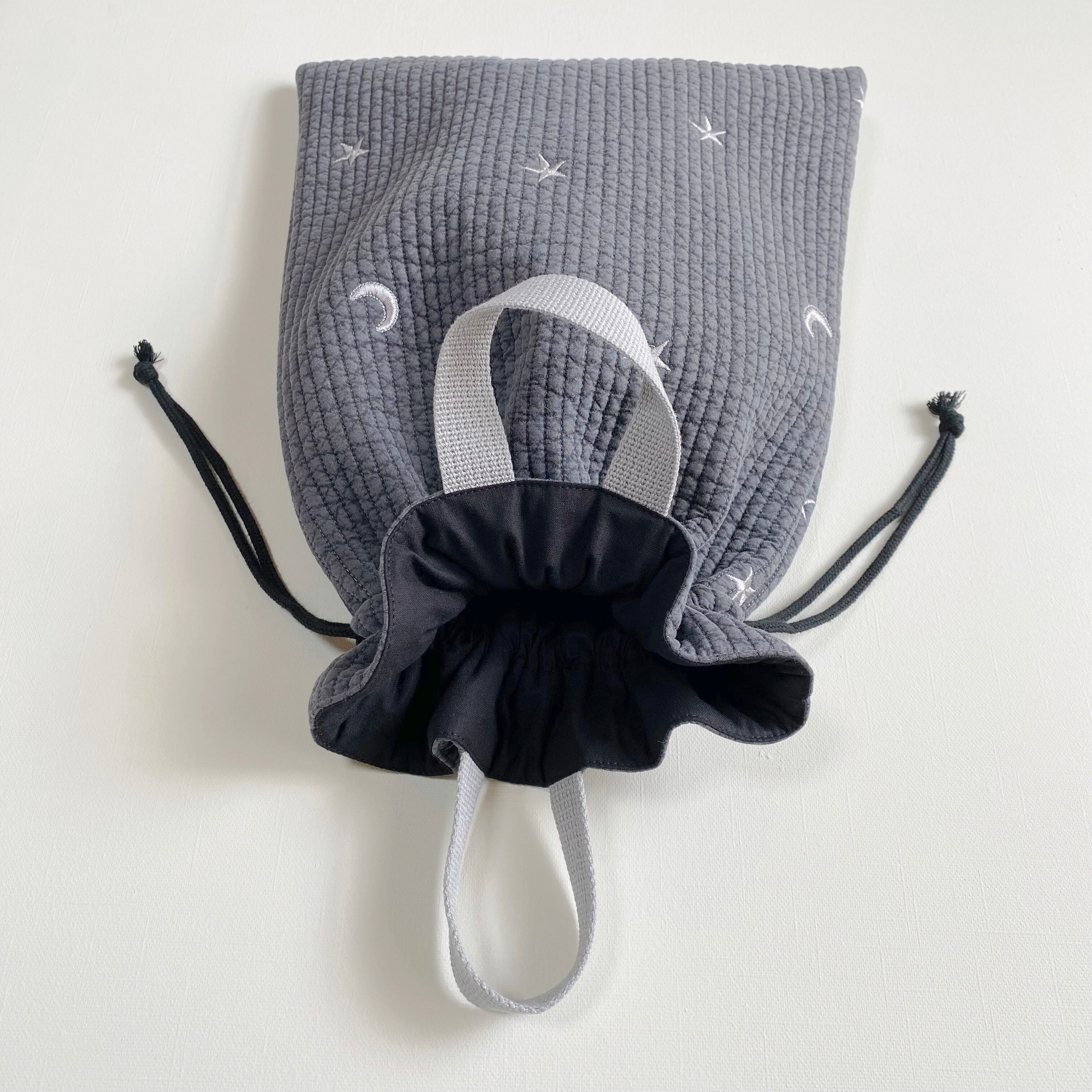 月や星の刺繍が優しくデザインされたヌビに、無地の裏地を合わせました。シンプルなデザインで大きくなっても飽きがこずに長くお使いいただけると思います。