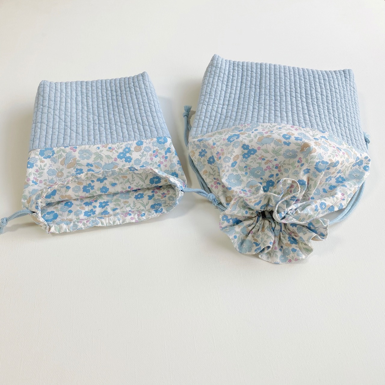 ライトブルーのヌビに、可愛い小花柄の裏地を合わせました。シンプルなデザインで大きくなっても飽きがこずに長くお使いいただけると思います。