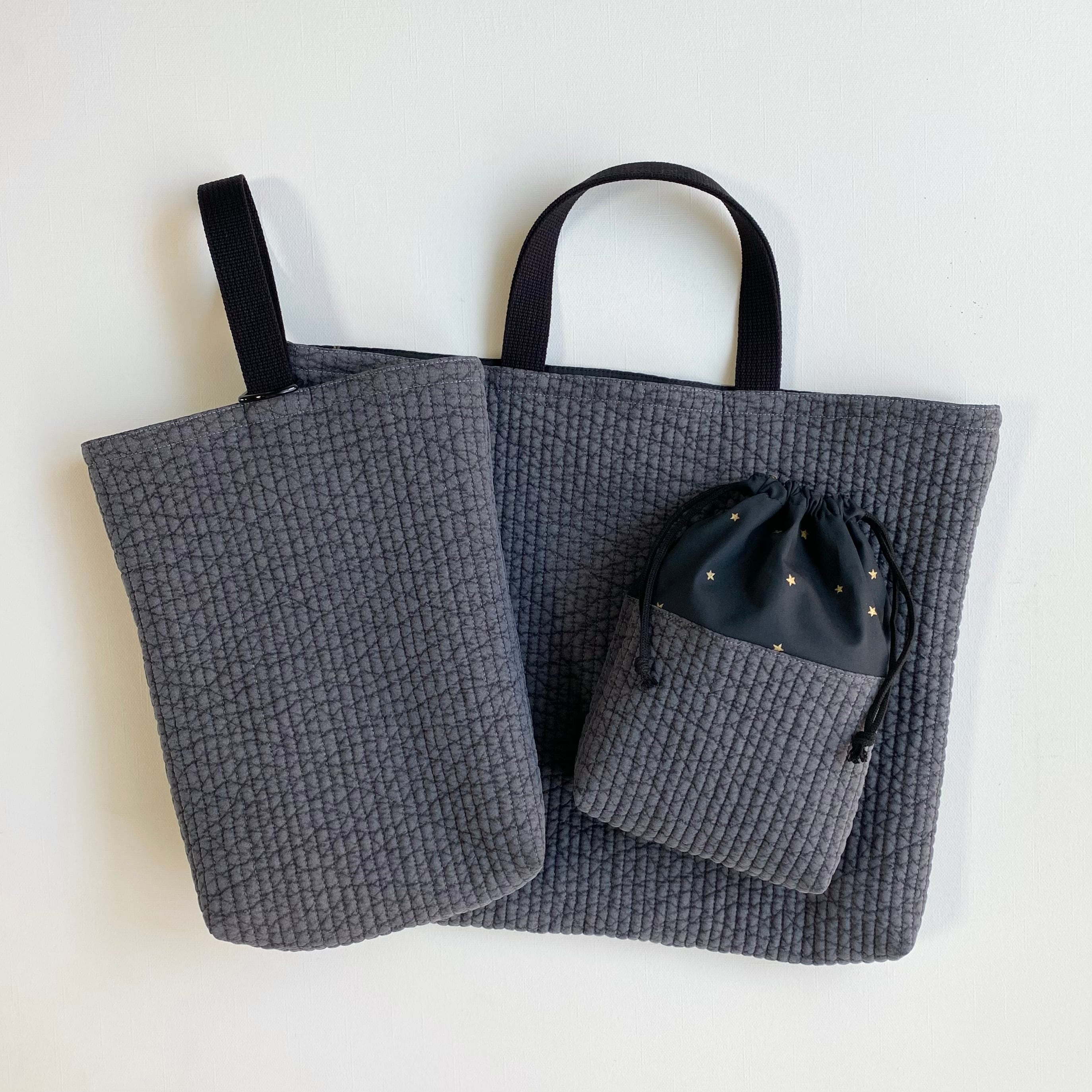 ダークグレーのヌビに、ゴールドラメの星柄の裏地を合わせました。シンプルなデザインで大きくなっても飽きがこずに長くお使いいただけると思います。
