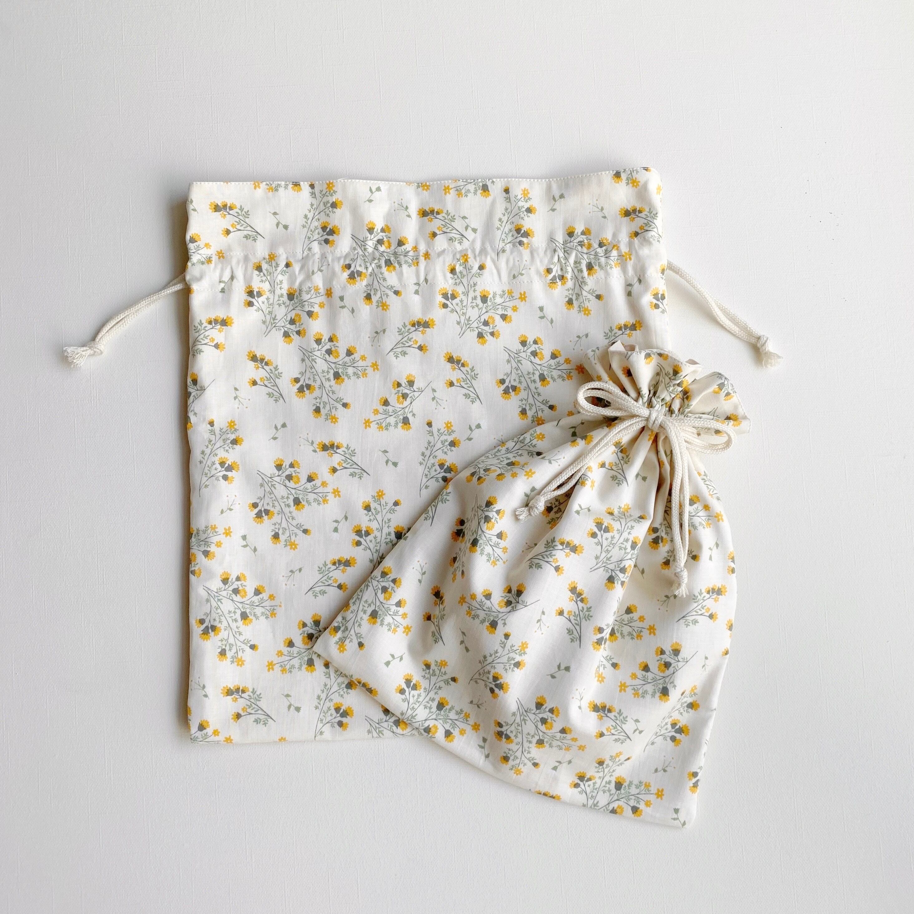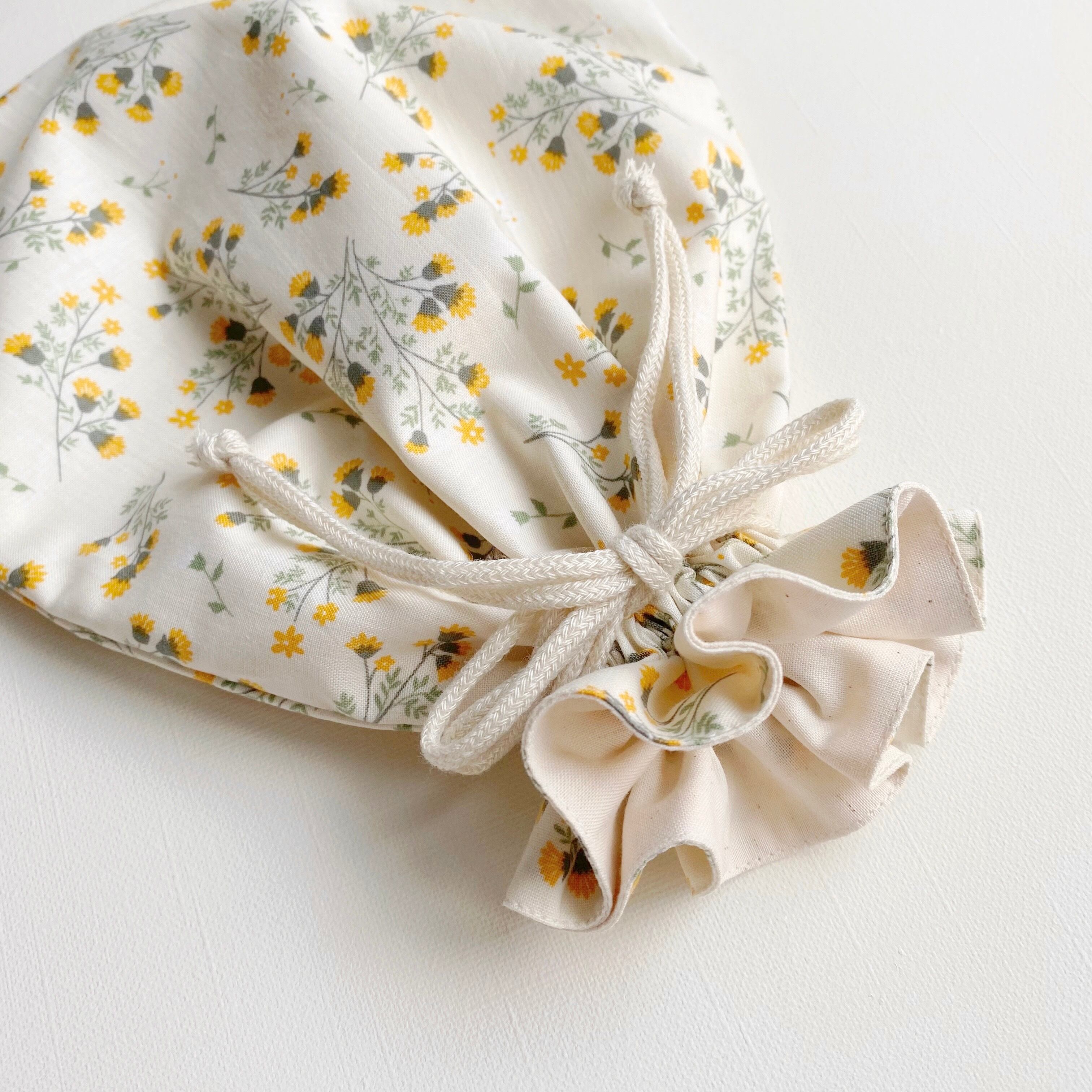 コップ袋とお着替え袋は、表はコットン生地で裏はシーチング生地のフリル巾着となっています。薄手の生地でかさばらず、裏地付きのため長くお使いいただけると思います。