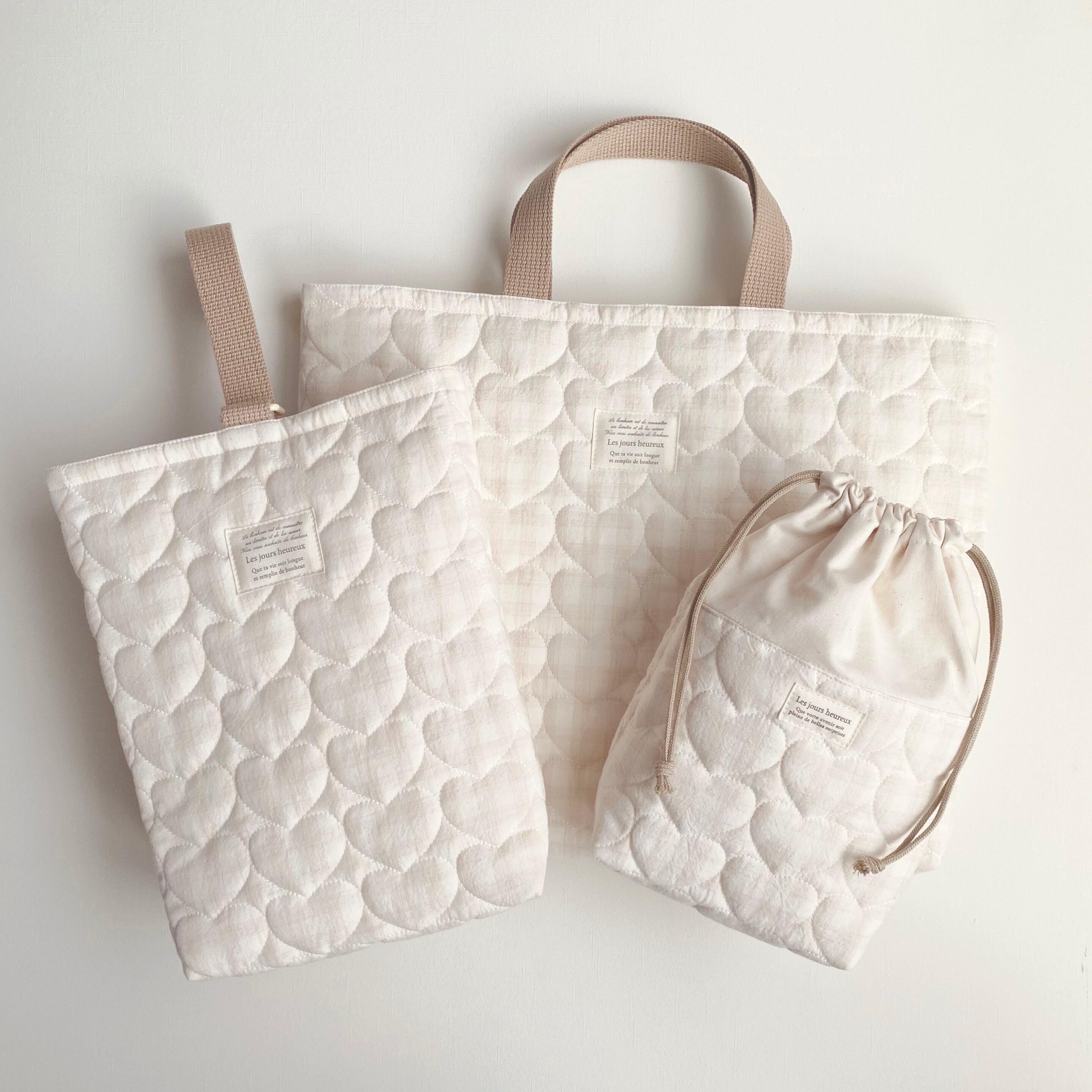 ハート ステッチ キルティング キルト ふわふわ ぷくぷく ギンガムチェック レッスンバッグ 通園バッグ シューズ袋 上靴入れ 丈夫 シンプル 韓国 かわいい 女の子 入園セット 入学セット 入学準備 入園準備 習い事 プレゼント 誕生日 クリスマス