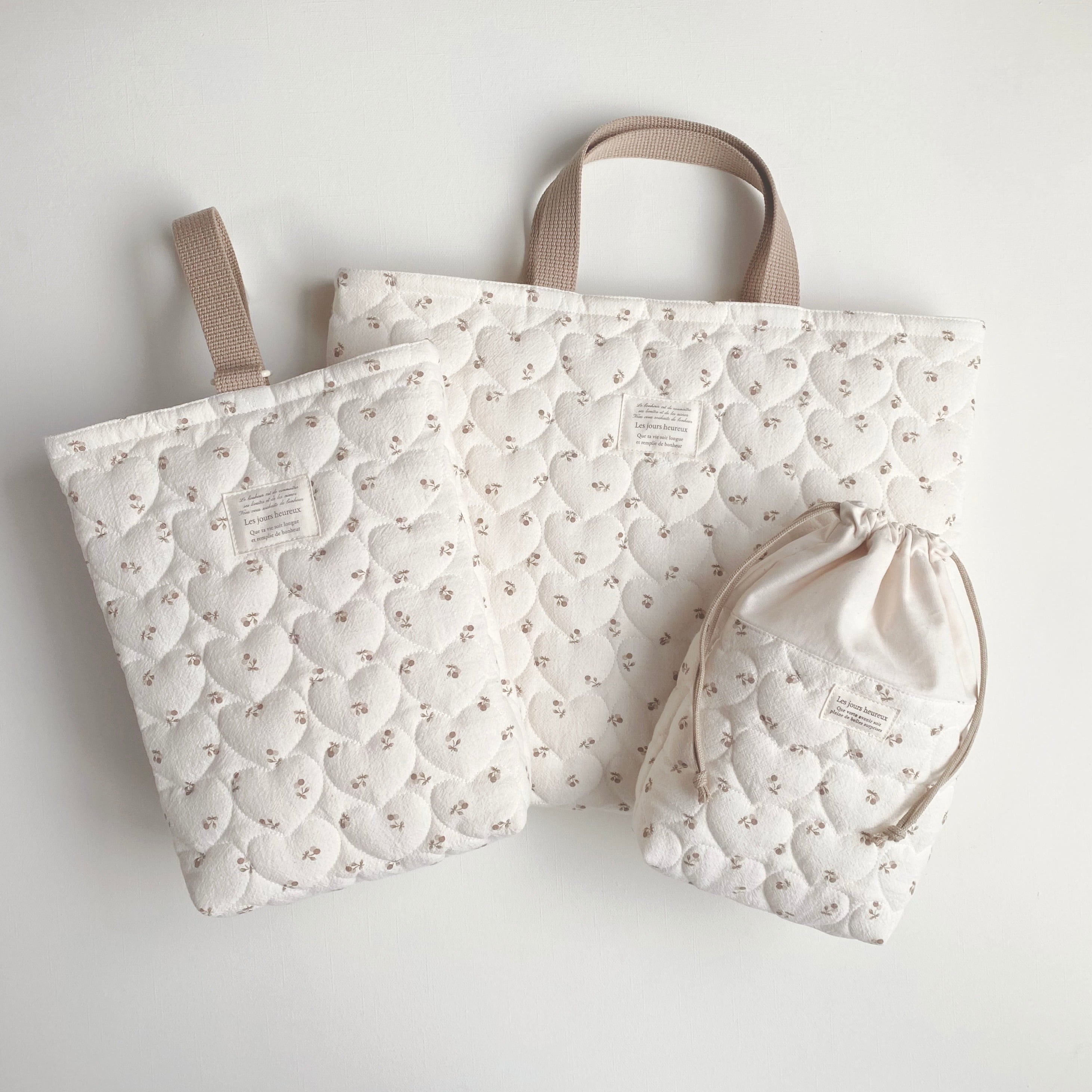 ハート ステッチ キルティング キルト ふわふわ ぷくぷく さくらんぼ レッスンバッグ 通園バッグ シューズ袋 上靴入れ 丈夫 シンプル 韓国 かわいい 女の子 入園セット 入学セット 入学準備 入園準備 習い事 プレゼント 誕生日 クリスマス