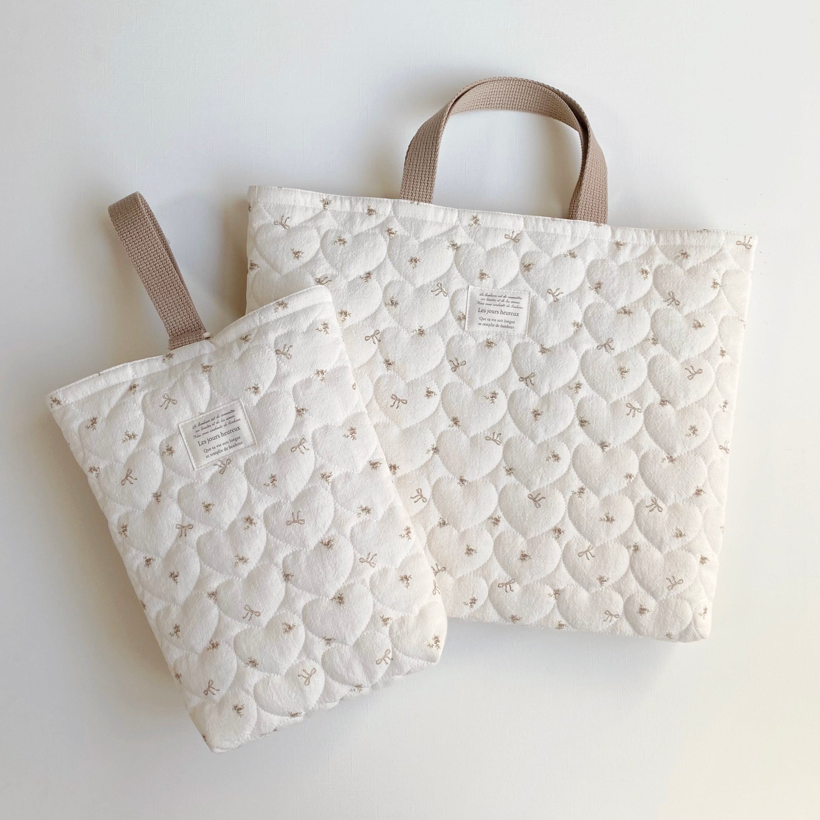 ハート ステッチ キルティング キルト ふわふわ ぷくぷく リボン レッスンバッグ 通園バッグ シューズ袋 上靴入れ 丈夫 シンプル 韓国 かわいい 女の子 入園セット 入学セット 入学準備 入園準備 習い事 プレゼント 誕生日 クリスマス