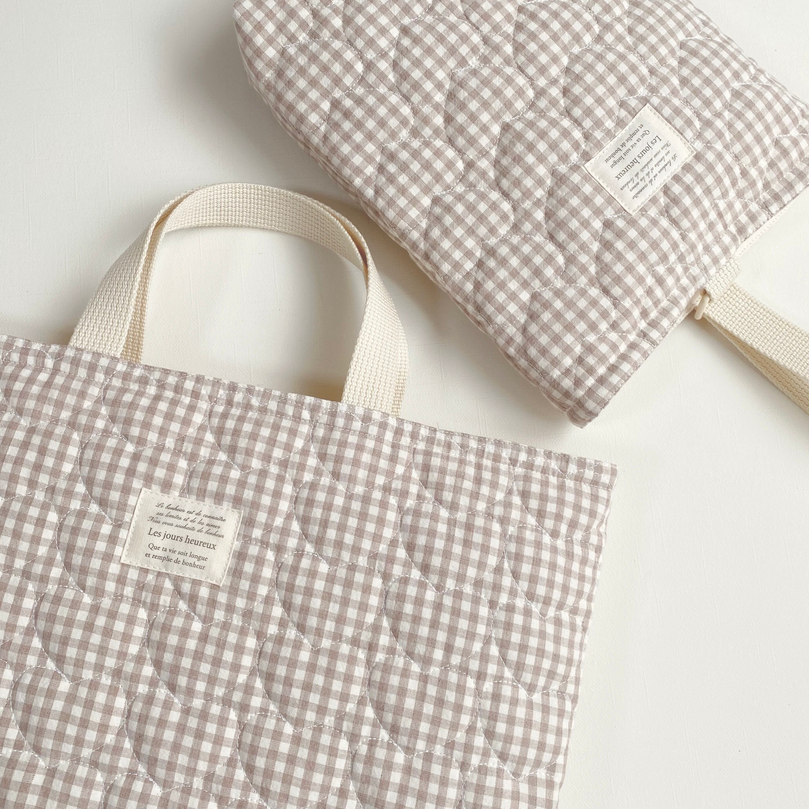 ハート ステッチ キルティング キルト ふわふわ ぷくぷく レッスンバッグ チェック モカ ブラウン 通園バッグ シューズ袋 上靴入れ 丈夫 シンプル 韓国 かわいい 女の子 入園セット 入学セット 入学準備 入園準備 習い事 プレゼント 誕生日 クリスマス