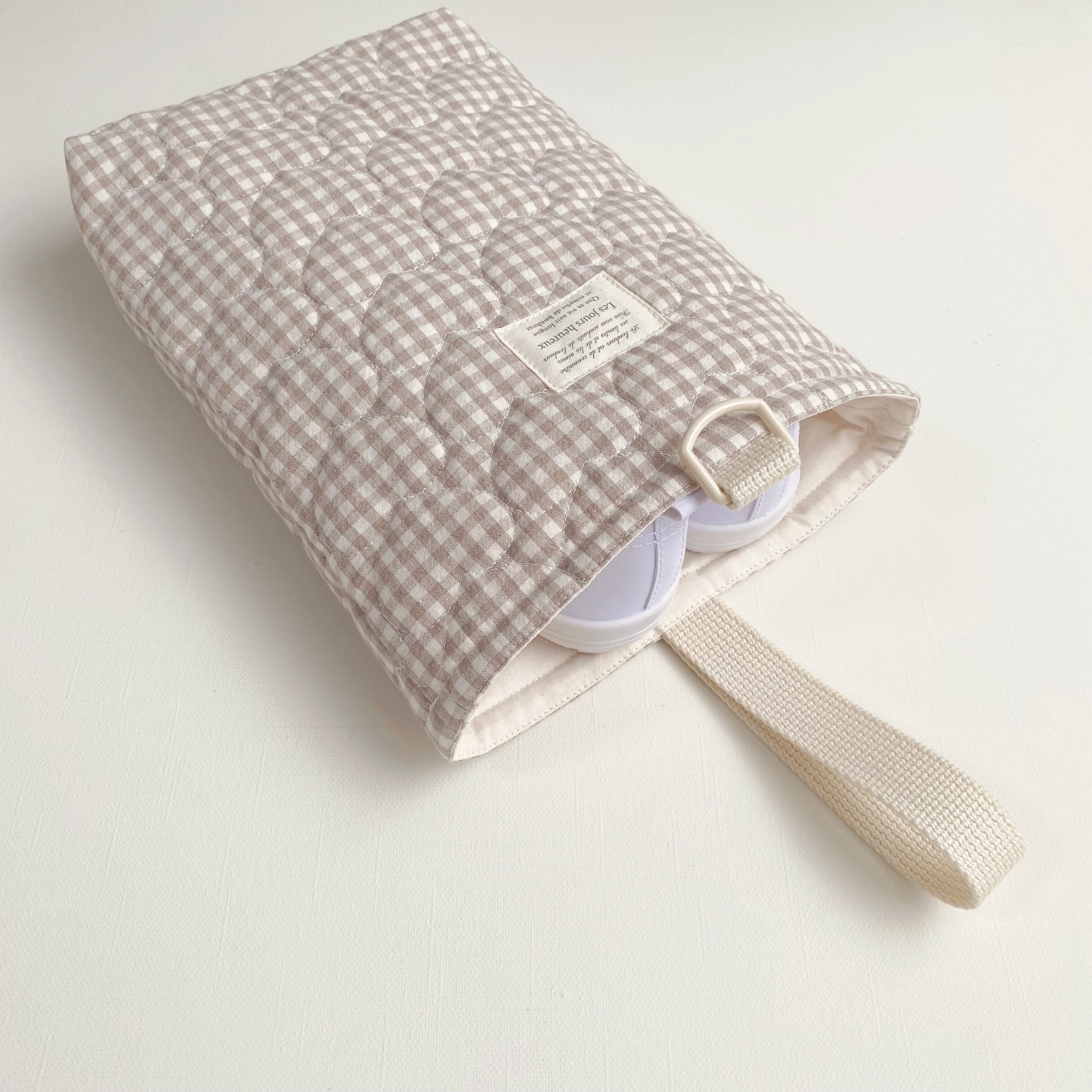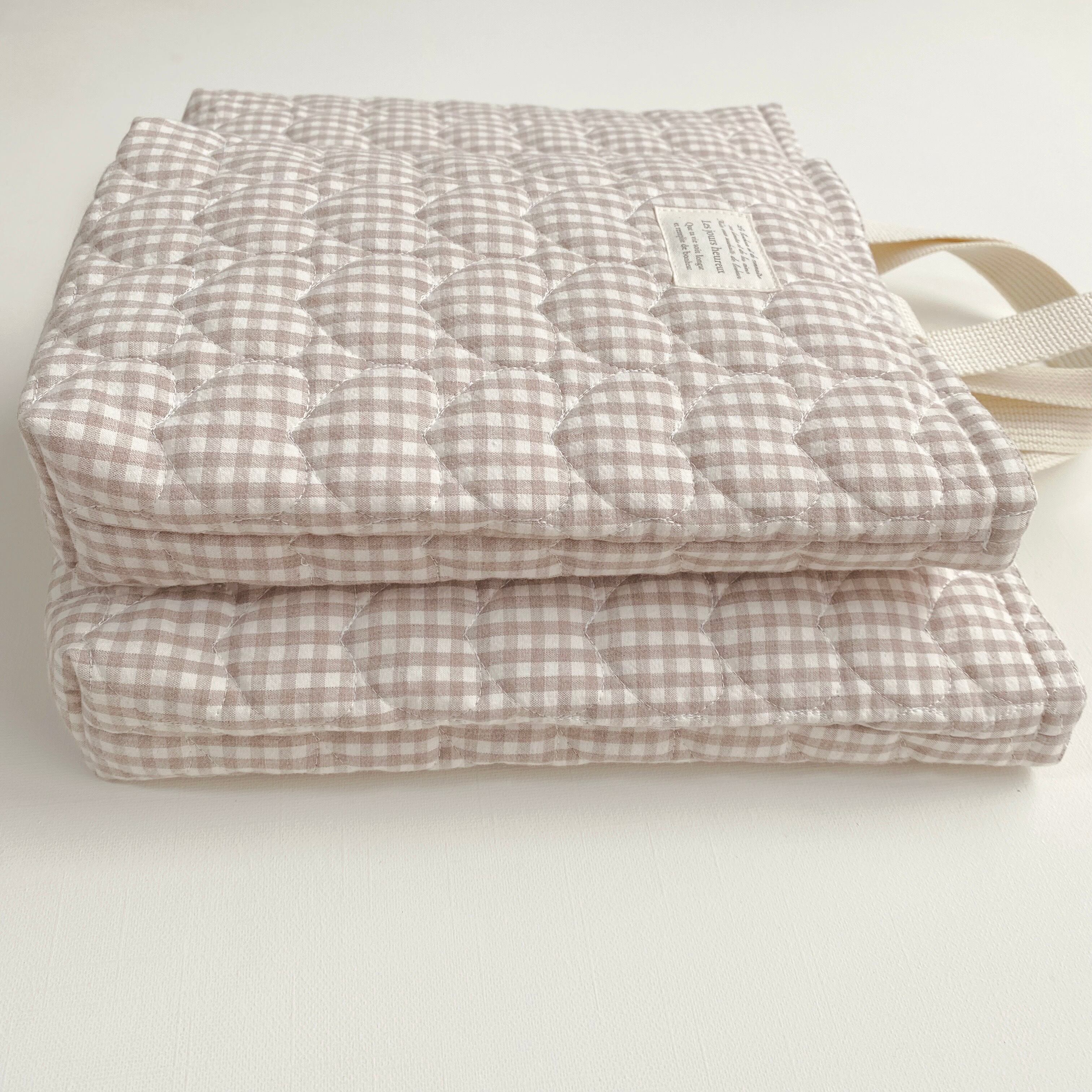 コットン100%の生地をハートの形でステッチされたキルティング生地に、生成色の裏地を合わせました。ナチュラルな風合いのチェック柄や、ぷくっとしたハートがとっても可愛いです◎